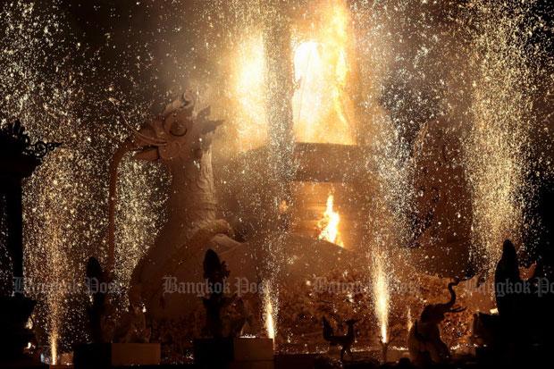 The cremation took place at exactly 10.15pm when the ceremony's most senior monk set fire to the crematorium.