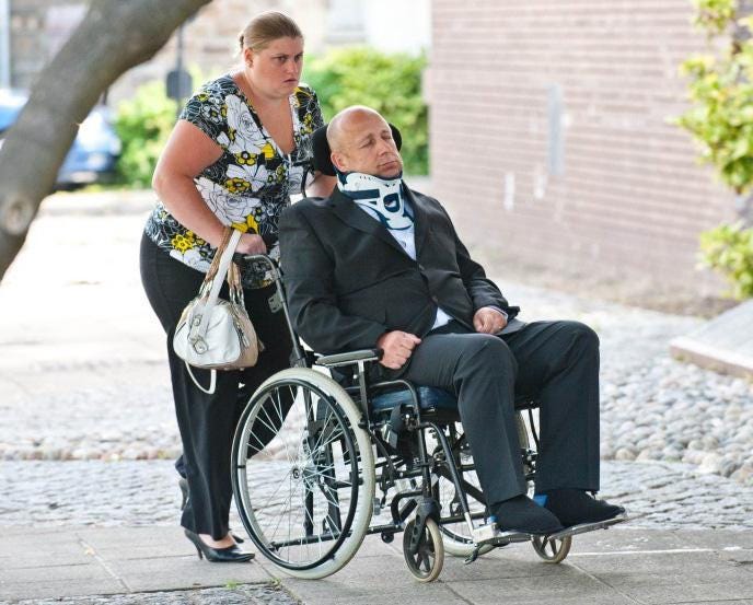 As well as admitting Knight to hospital - where he spent a total of 10 weeks and was subjected to several expensive tests - the couple arrived at court with him pretending to be unconscious while his 34-year-old wife pushed him in a wheelchair.