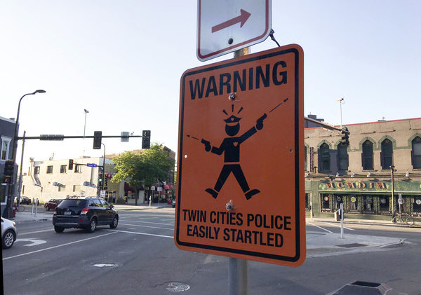 Corey Schmidt, spokesman for the Minneapolis Police Department, said he had seen a Facebook post earlier about the St. Paul sign but didn't know about the Minneapolis one. He had no comment.