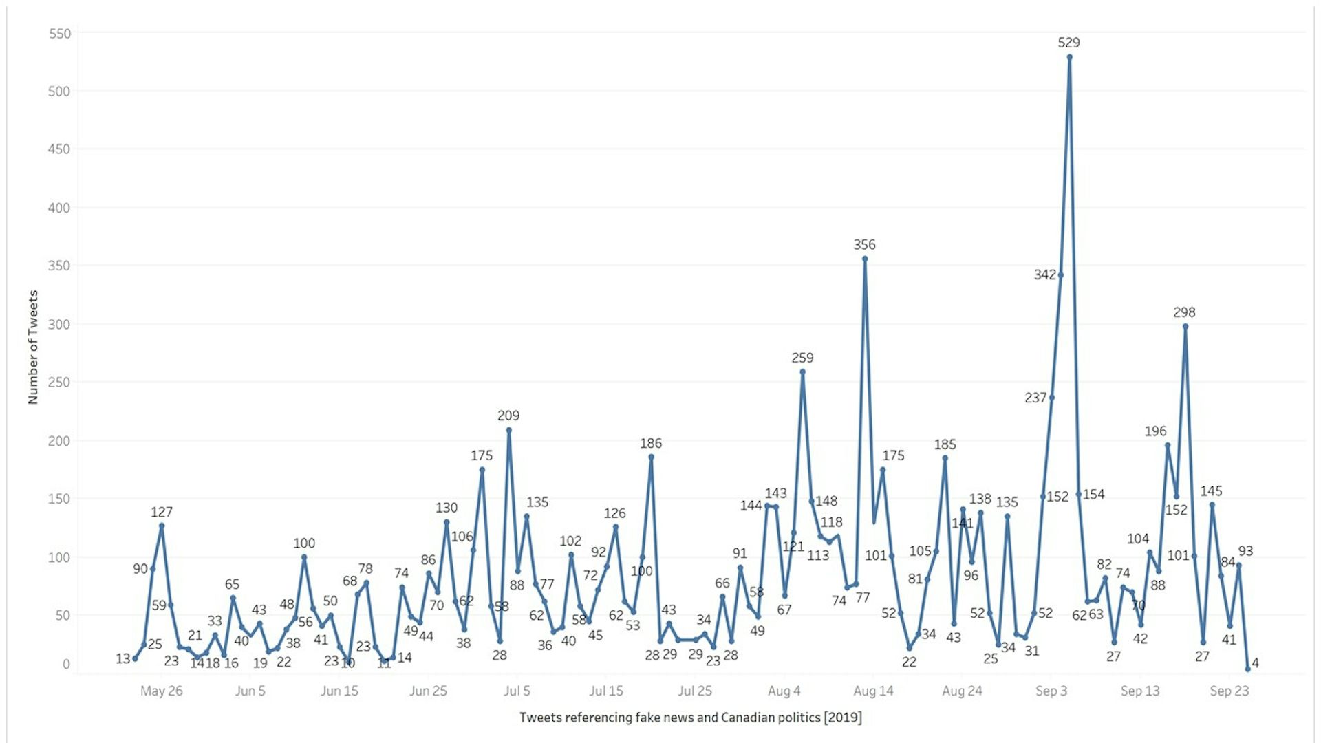 Using Twitter, I extracted 10,698 tweets that contain “fakenews” and “fake news” from a larger dataset of 2,496,738 tweets that referenced Canadian politics using the hashtag #CDNpoli. These tweets were posted by 206,273 unique users and were collected between May 23 to Sept. 25, 2019. Here’s a visualization of the tweets that refer to fake news: