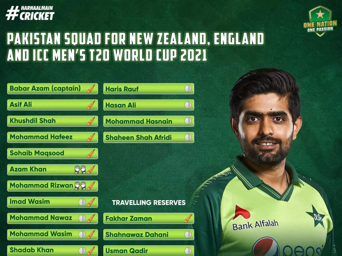 The squad includes five batters (Asif, Babar Azam, Khushdil, Mohammad Hafeez and Sohaib Maqsood), two wicketkeeper-batters (Azam Khan and Mohammad Rizwan), four all-rounders (Imad Wasim, Mohammad Nawaz, Mohammad Wasim Jnr and Shadab Khan) and four fast bowlers (Haris Rauf, Hasan Ali, Mohammad Hasnain and Shaheen Shah Afridi).