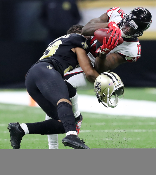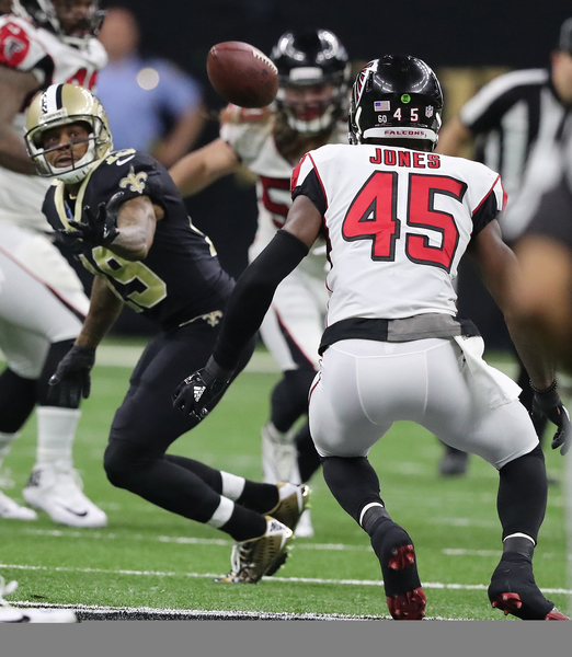 Jones caught a pass for 9 yards on the first play of the game against the Saints to move pass Terance Mathis into second place on the franchise's all-time time receptions list.
