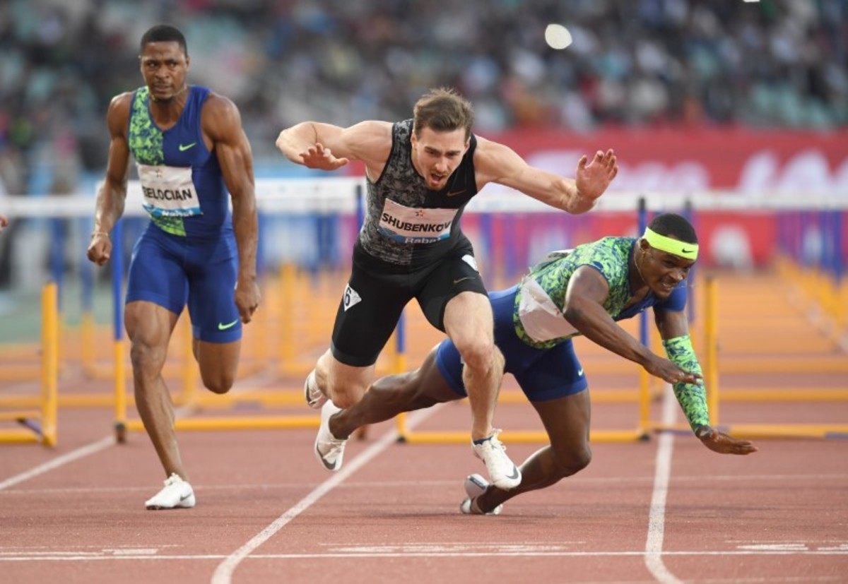 Russian Shubenkov came from behind to catch McLeod before the last hurdle but was tripped just ahead of the finish by the stumbling Jamaican while still somehow managing to fall forward over the line first to claim victory in 13.12 seconds.