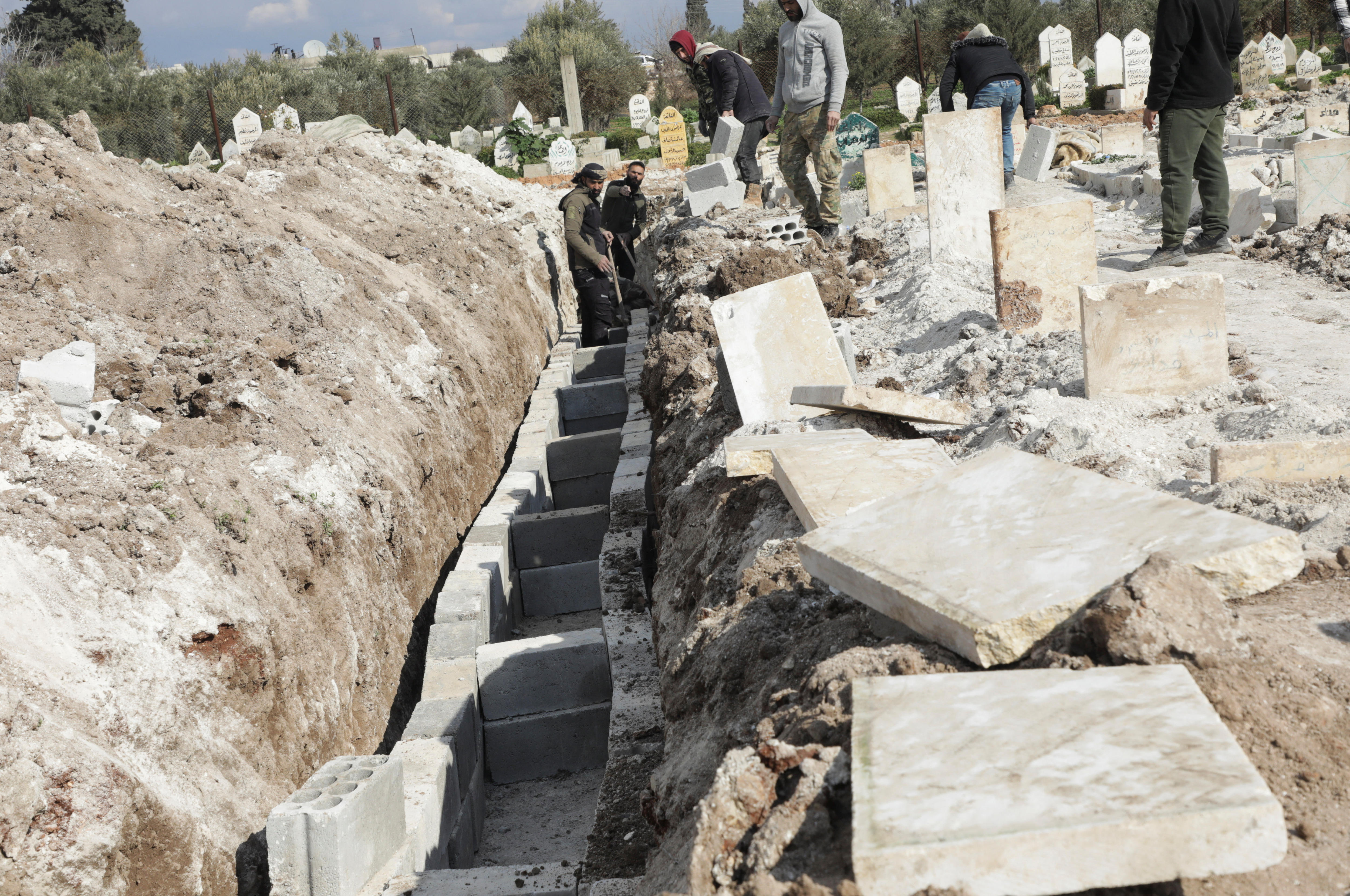 Pieces of debris from fallen buildings were used as headstones in both Syria and Türkiye in rapidly expanding cemeteries and makeshift graveyards.