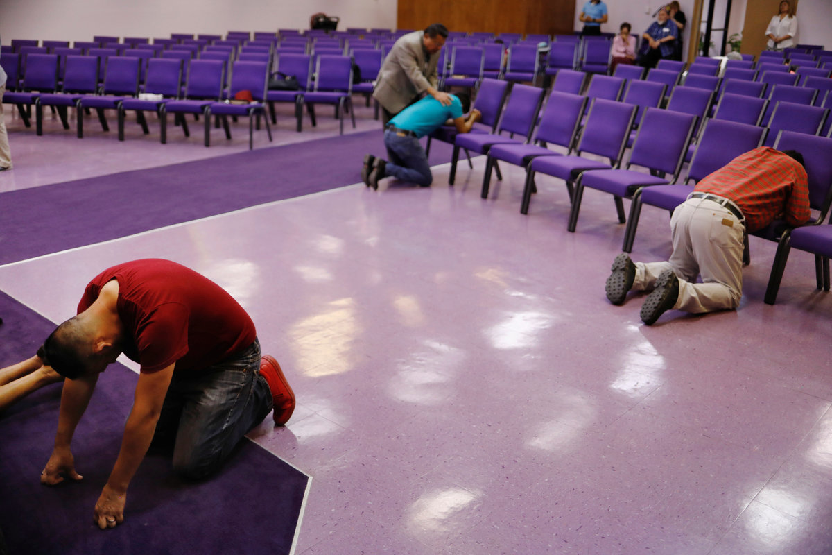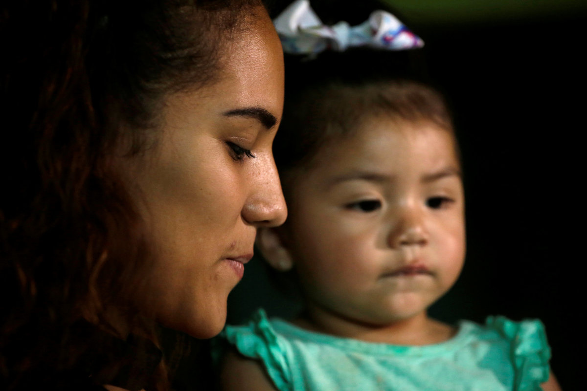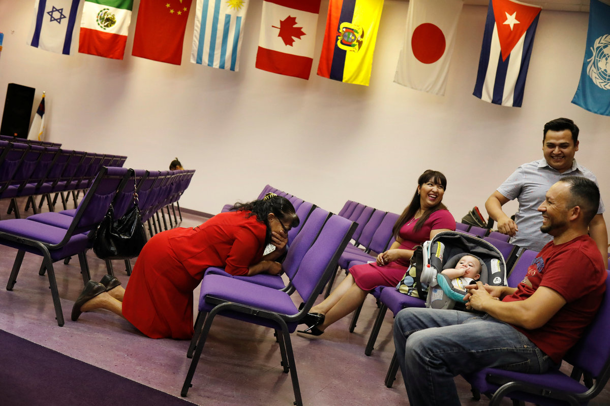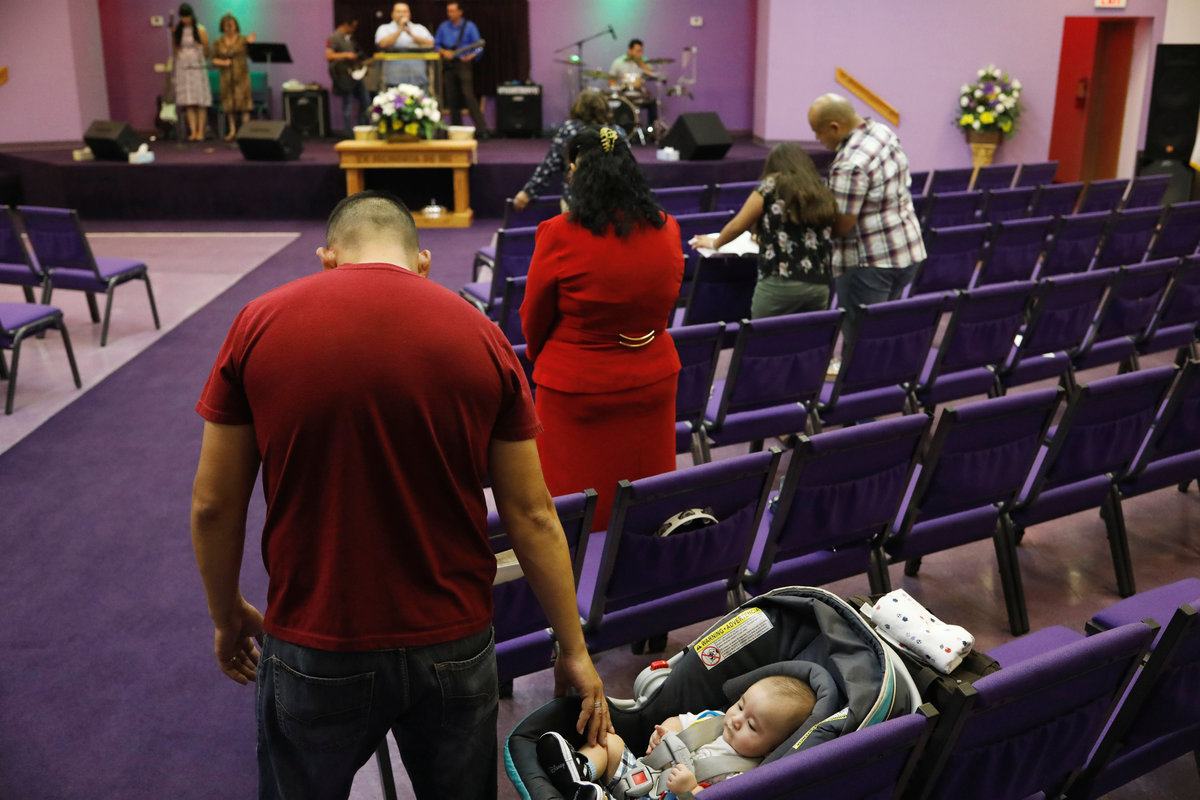 Marcelino Pizarro (R) talks with his wife, Alejandra Aguilar, and a friend while watching his baby son, Matias, before a church service near their home in El Paso, Texas, U.S., May 9, 2018. REUTERS/Lucas Jackson