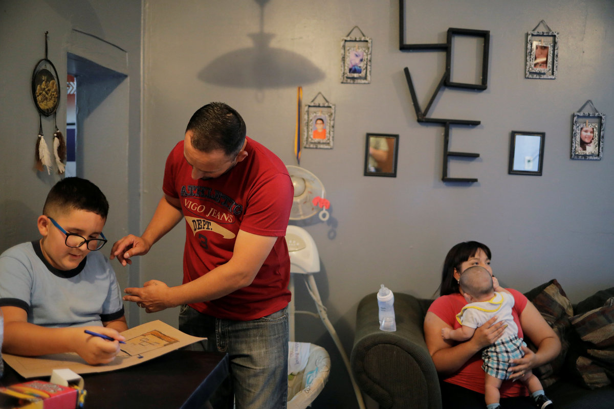 Marcelino Pizarro (2nd L) helps his son, Cesar, with a project while his wife, Alejandra Aguilar holds their baby son at home in El Paso, Texas, U.S., May 9, 2018. REUTERS/Lucas Jackson