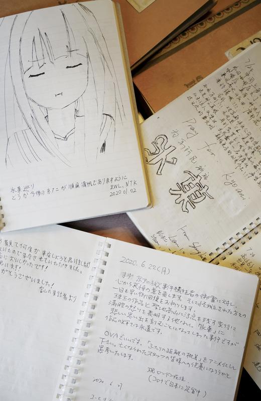 Places associated with the works of Kyoto Animation are considered sacred among fans. An old building that used to be an elementary school in Toyosato, Shiga Prefecture, is considered to be the setting of anime "K-ON!" A coffee shop called Bagpipe in Takayama, Gifu Prefecture, is believed to be associated with another anime, "Hyouka." When fans visit these places they write messages on blackboards and in notebooks located there. In a message for "Hyouka" on June 22, a fan wrote, "The incident will be etched with sad memories, but the brilliance of the work will live on forever."