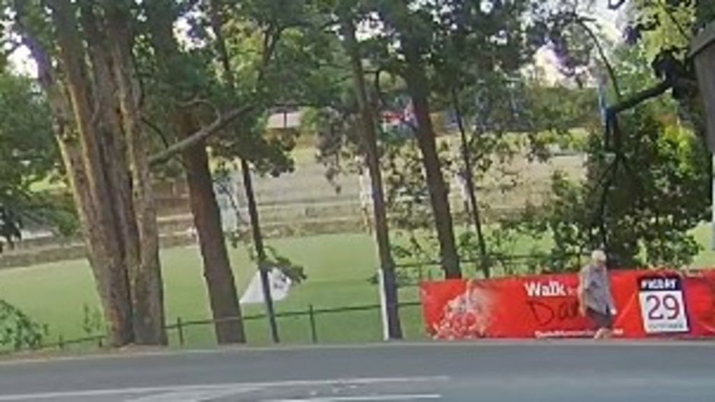 The vision shows an older man, aged between 65 and 70, spraying the banners then hiding the paint can under a white cloth in his hand.