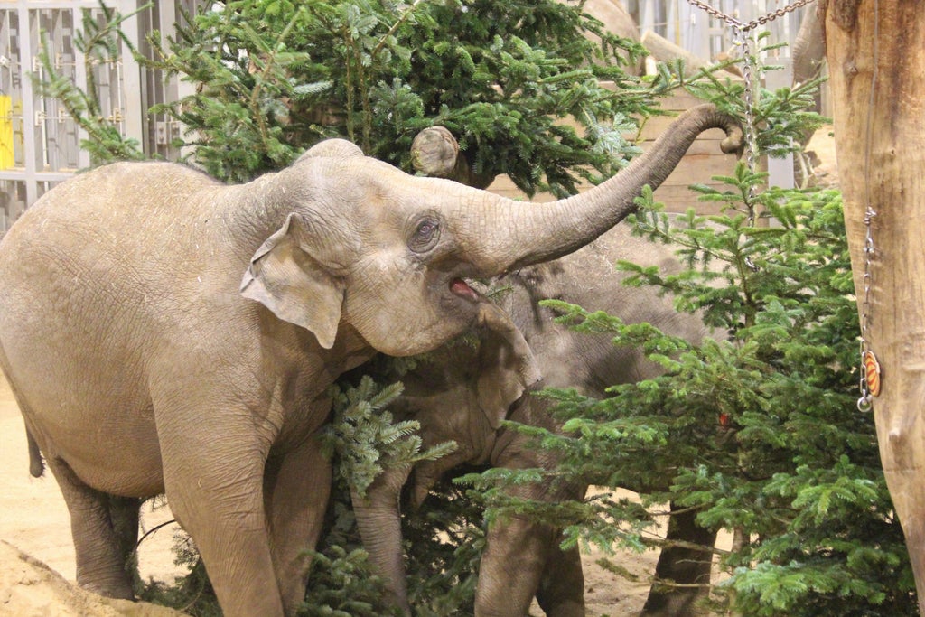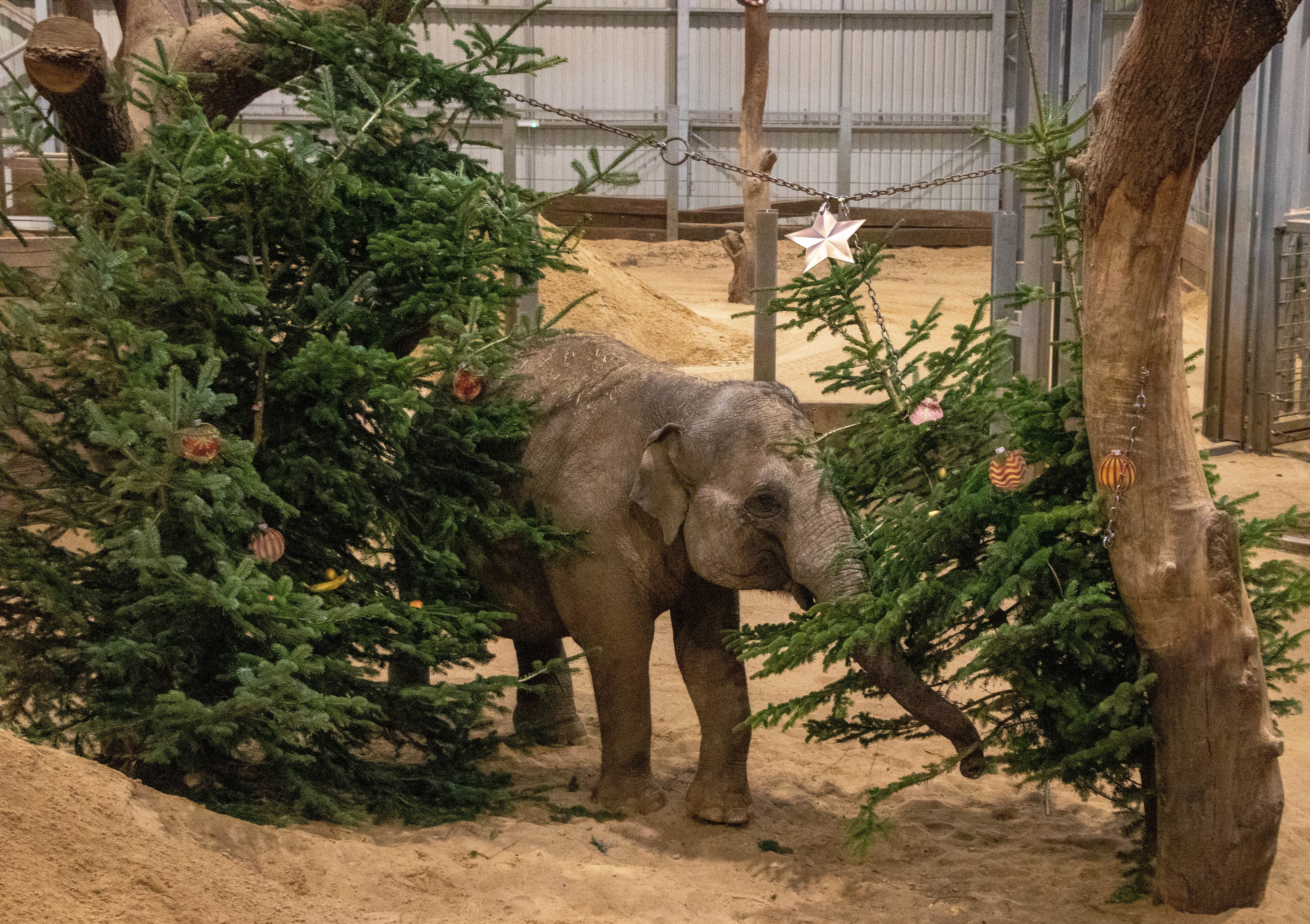 The keepers at ZSL Whipsnade Zoo decorated pine trees, some up to 20ft tall, with elephant-friendly decorations made of fruit and wood to begin the Christmas festivities.