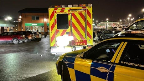 GMP said in a tweet the ambulance was "reportedly carrying a family when it arrived at #Asda Harpurhey with blue lights flashing.
