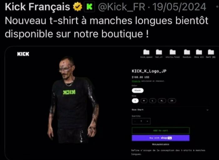 Another post from Kick France announced a “new long-sleeved t-shirt” that featured an image of Pormanove’s head, arms, and torso covered with dark liquid.