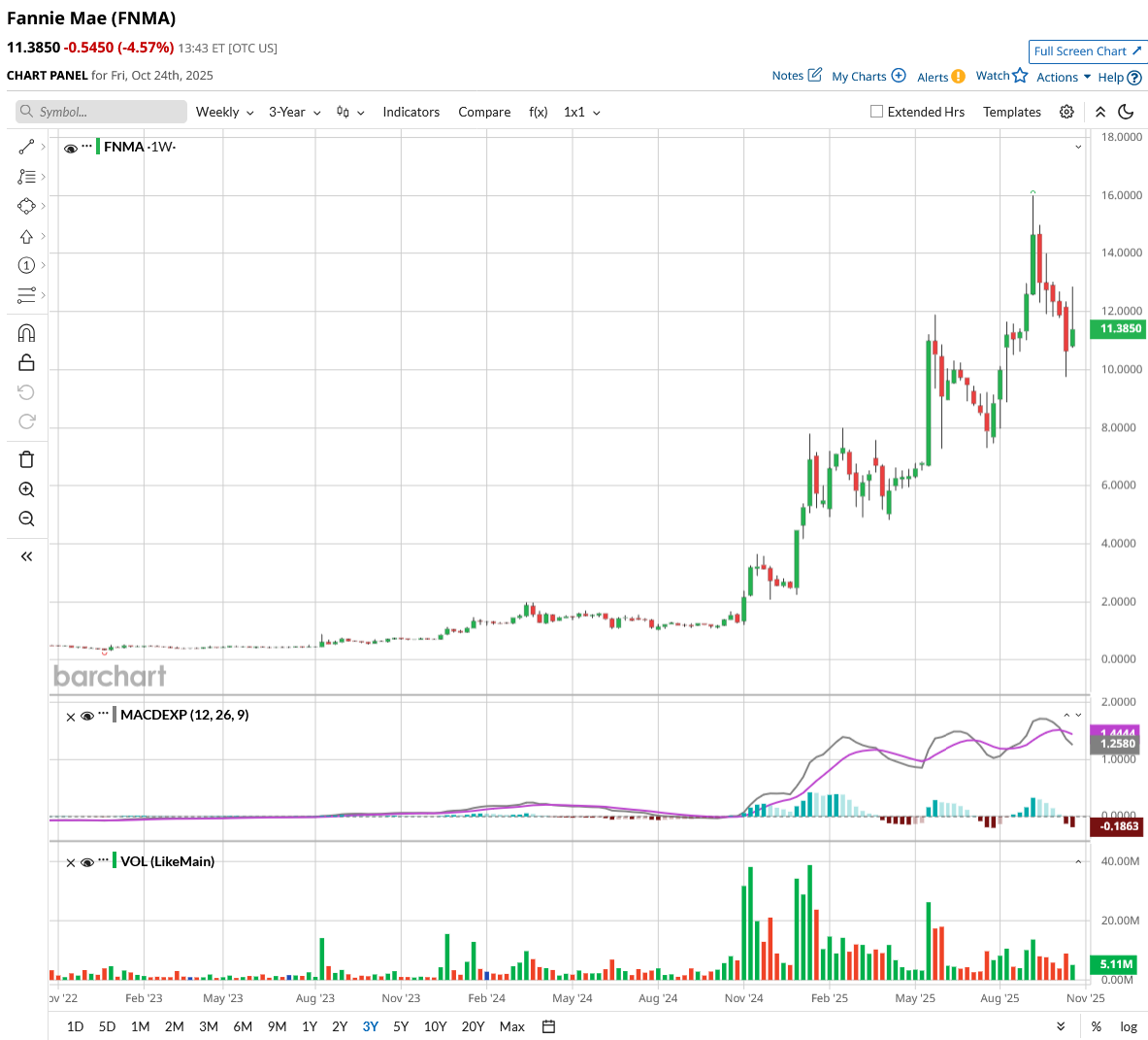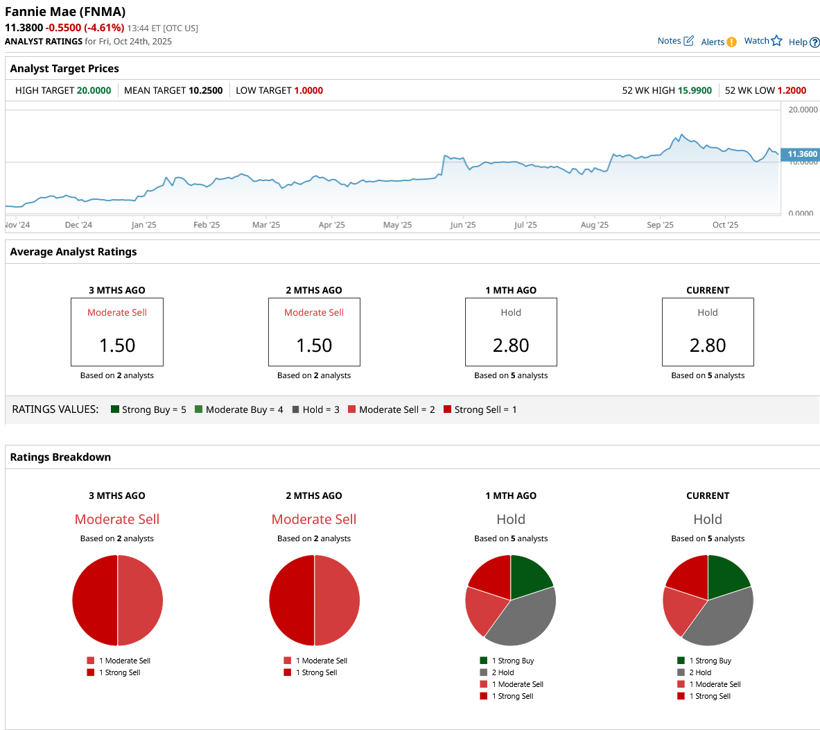 Out of five analysts tracking FNMA stock, one recommends “Strong Buy,” two recommend “Hold,” one recommends “Moderate Sell,” and one recommends “Strong Sell.” The average FNMA stock price target is $10.25, below the current trading price of $11.38.