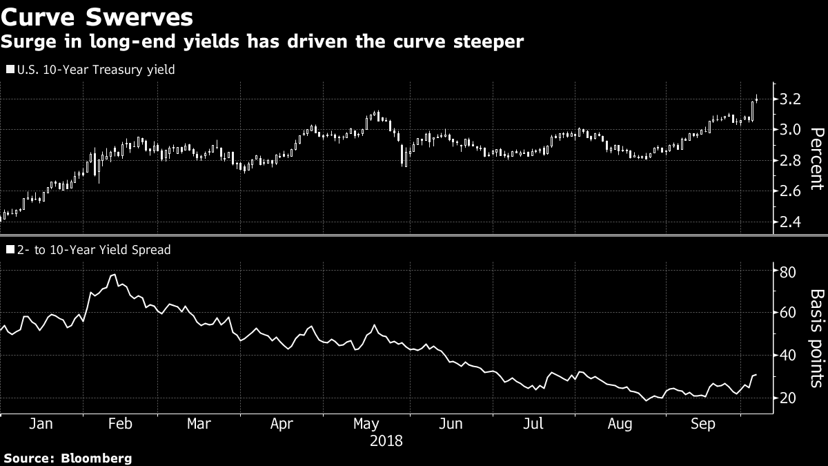 The flattening camp is far from packing up, judging by large trades in the middle of the curve during Thursday’s session, which helped to stall the steepening move early in the U.S. session. But the debate over the curve’s path is heating up, stoked by this week’s strong economic data and Federal Reserve Chairman Jerome Powell’s enthusiastic descriptions of the state of the economy.