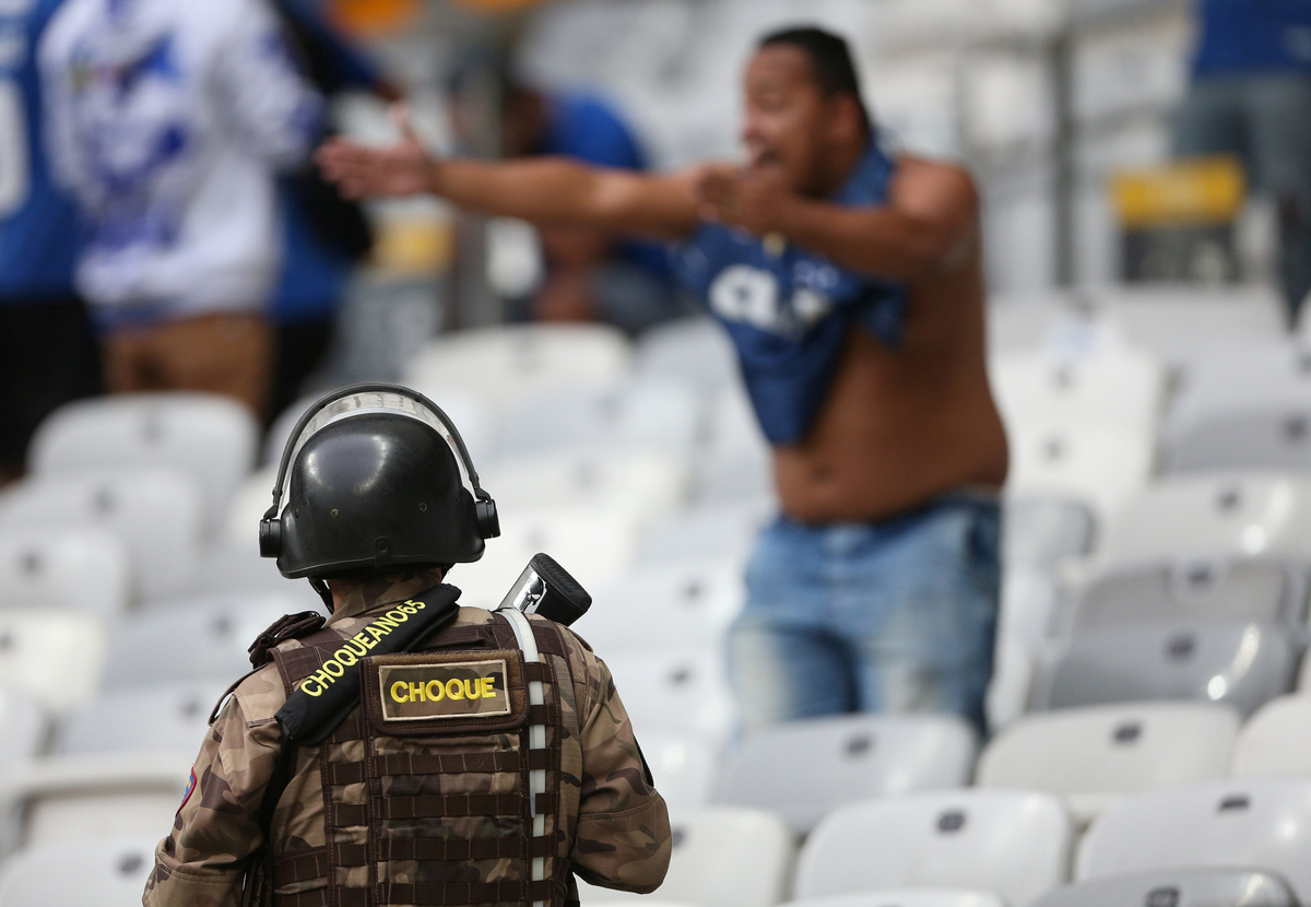 Soccer Football - Brasileiro Championship - Cruzeiro v Palmeiras - Mineirao Stadium, Belo Horizonte, Brazil - December 8, 2019 Cruzeiro fans clash with Riot police REUTERS/Cristiane Mattos