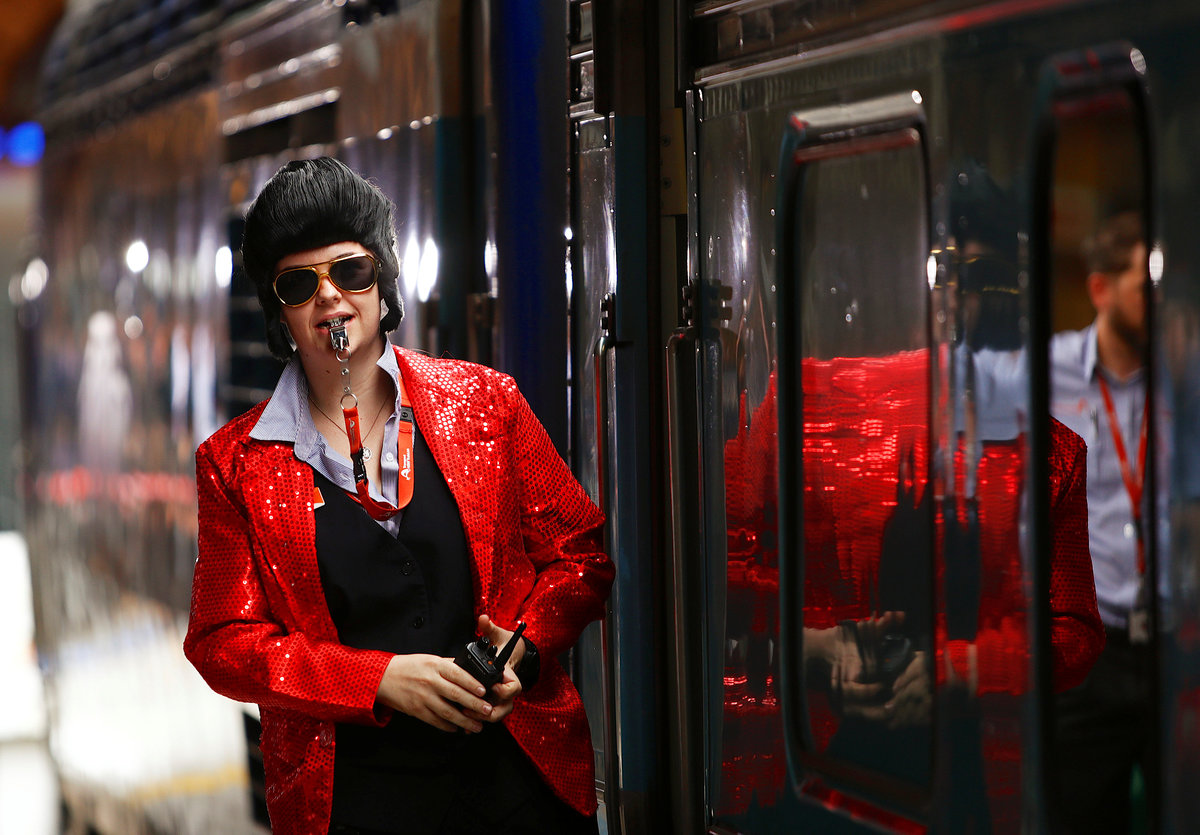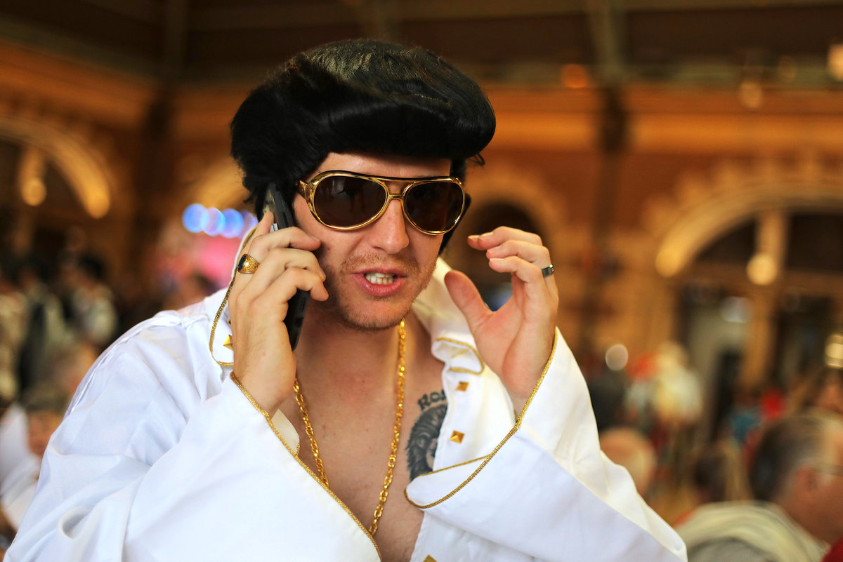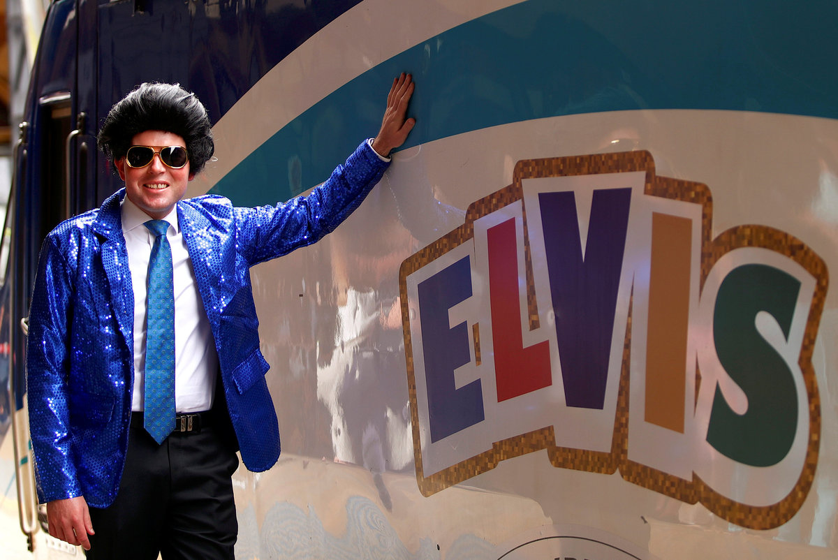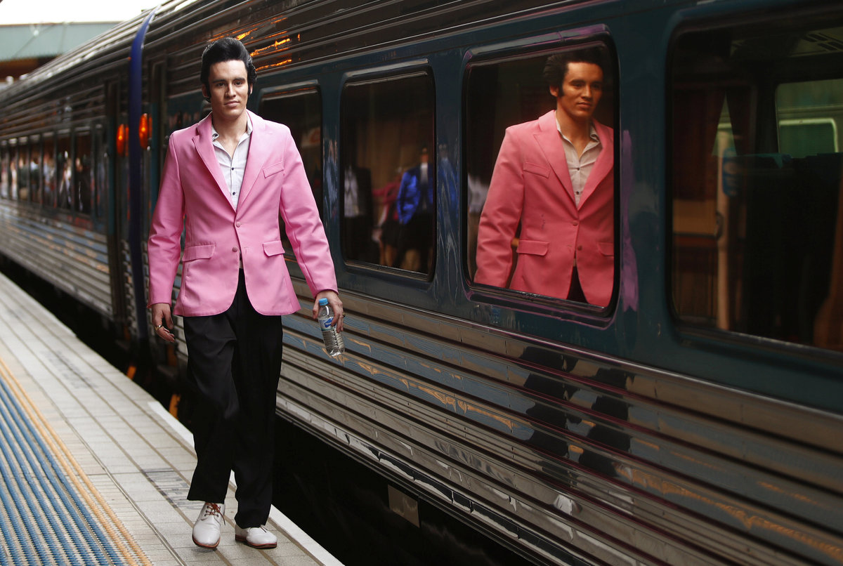 A train guard dressed as Elvis Presley blows a whistle to signal the departure of the Elvis Express train at Sydney's Central station bound for the 26th annual Elvis Festival being held in the New South Wales town of Parkes in Australia, January 11, 2018. REUTERS/Daniel MunozElvis Presley impersonator and Mayor of the town of Parkes, Ken Keith, stands aboard the Elvis Express train at Sydney's Central station before it departs for the 26th annual Elvis Festival being held in the New South Wales town of Parkes in Australia, January 11, 2018. REUTERS/Daniel MunozElvis Presley impersonator Brody Finlay looks at his reflection in a window of the Elvis Express train at Sydney's Central station before it departs for the 26th annual Elvis Festival being held in the New South Wales town of Parkes in Australia, January 11, 2018. REUTERS/Daniel MunozElvis Presley impersonator Brody Finlay greets onlookers before boarding the Elvis Express train at Sydney's Central station before it departs for the 26th annual Elvis Festival being held in the New South Wales town of Parkes in Australia, January 11, 2018. REUTERS/Daniel MunozElvis Presley impersonator Brody Finlay walks alongside the Elvis Express train at Sydney's Central station before it departs for the 26th annual Elvis Festival being held in the New South Wales town of Parkes in Australia, January 11, 2018. REUTERS/Daniel MunozElvis Presley impersonator Sean Wright poses next to the Elvis Express train at Sydney's Central station before it departs for the 26th annual Elvis Festival being held in the New South Wales town of Parkes in Australia, January 11, 2018. REUTERS/Daniel MunozAn Elvis Presley impersonator hangs from the Elvis Express train at Sydney's Central station before it departs for the 26th annual Elvis Festival being held in the New South Wales town of Parkes in Australia, January 11, 2018. REUTERS/Daniel Munoz