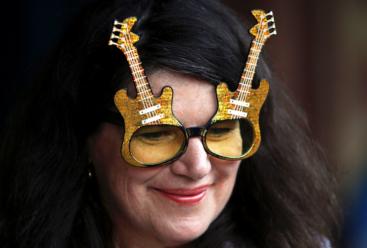 An Elvis Presley fan wears glasses shaped in the form of guitars as she prepares to board the Elvis Express train at Sydney's Central station before it departs for the 26th annual Elvis Festival being held in the New South Wales town of Parkes in Australia, January 11, 2018. REUTERS/Daniel Munoz
