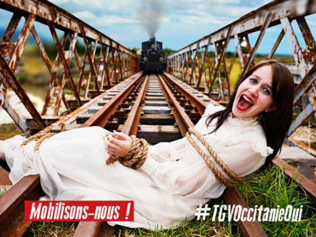 Robert Menard, mayor of Beziers, tweeted out posters showing a woman tied to train tracks and screaming under the caption “With High-Speed Trains she would have suffered less!”