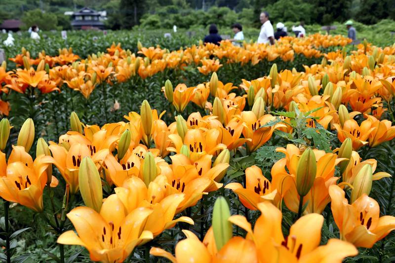 The early bloom of orange lilies are seen at Kurobane Lily Garden in Otawara, Tochigi Prefecture, on Wednesday. About 13,000 lilies in 40 varieties are planted in the 2,500-square-meter garden. Opened in 1991, the garden has been run by a group of local residents. But it will close on July 19 due to the aging of the association members.