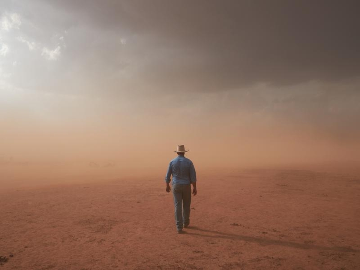 An eerie image of a farmer in a dust storm on his 1000-acre, drought-affected property has won its creator the 2021 National Photographic Portrait Prize.
