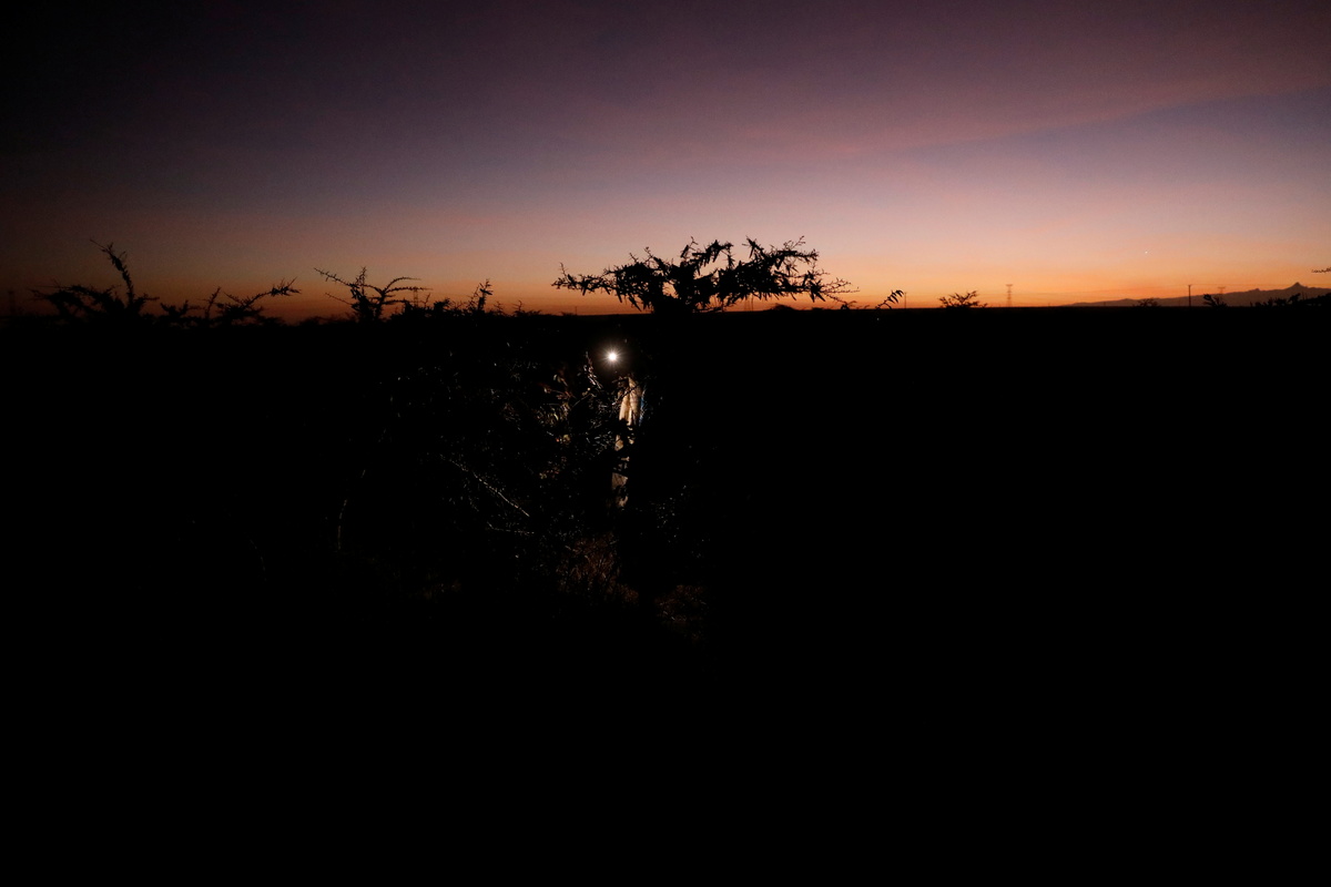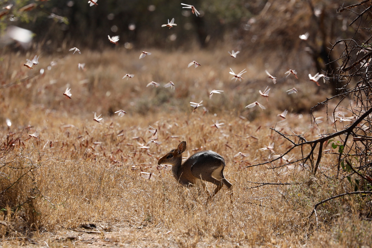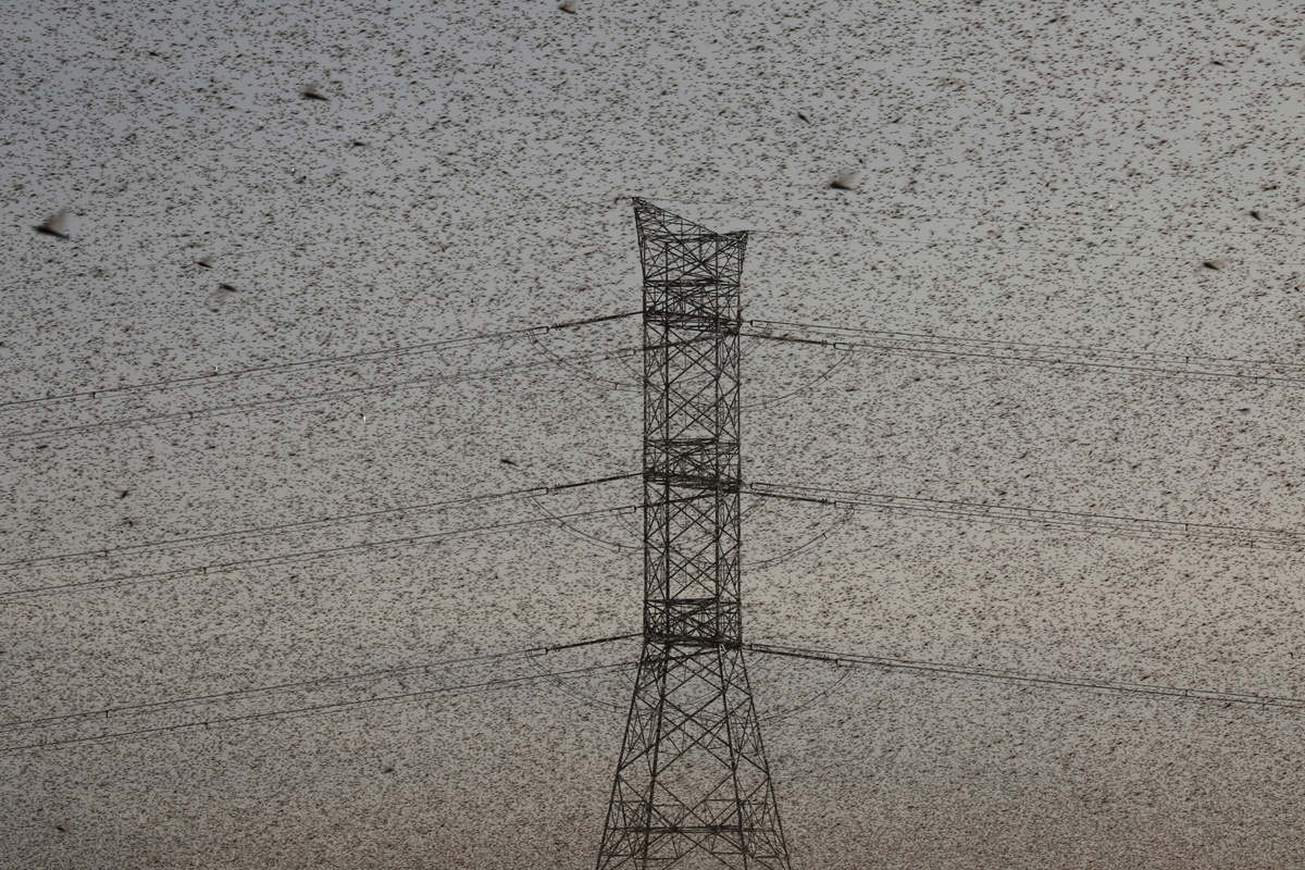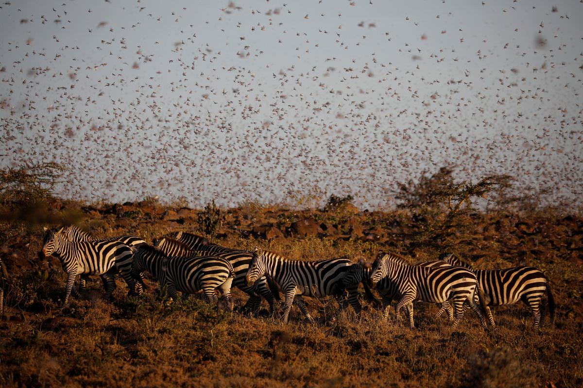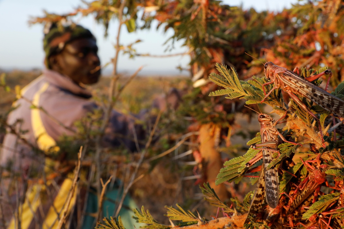 A man tries to chase away a swarm of desert locusts in Naiperere, near the town of Rumuruti, Kenya, January 30, 2021. REUTERS/Baz Ratner A swarm of desert locusts engulf a high voltage electricity transmission tower near the town of Rumuruti, Kenya, January 31, 2021. REUTERS/Baz Ratner Men use a net to harvest desert locusts, near the town of Rumuruti, Kenya, February 1, 2021. REUTERS/Baz Ratner Desert locusts caught during a harvest are stored inside a sack near the town of Rumuruti, Kenya, February 1, 2021. REUTERS/Baz Ratner A man carries a sack on his shoulder, filled with desert locusts that he harvested, near the town of Rumuruti, Kenya, February 1, 2021. REUTERS/Baz Ratner People load a pick-up truck with sacks filled with harvested desert locusts near the town of Rumuruti, Kenya, February 1, 2021. REUTERS/Baz Ratner Philip Ouma, a laboratory manager, tests the nutritional value of desert locusts at the laboratory Spectralab, in Nairobi, Kenya, February 16, 2021. REUTERS/Baz Ratner Philip Ouma, a laboratory manager, tests the nutritional value of desert locusts at the laboratory Spectralab, in Nairobi, Kenya, February 16, 2021. REUTERS/Baz Ratner Dishes containing ground desert locusts are dried inside a furnace at the laboratory Spectralab in Nairobi, Kenya, February 16, 2021. REUTERS/Baz Ratner Philip Ouma, a laboratory manager, holds a dish containing ground desert locusts at the laboratory Spectralab, in Nairobi, Kenya, February 16, 2021. REUTERS/Baz Ratner A chicken feeds on crushed desert locusts after they were left out to dry, before the locusts are made into animal feed, at a farm near the town of Rumuruti, Kenya, February 3, 2021. REUTERS/Baz Ratner A man harvests desert locusts, near the town of Rumuruti, Kenya, February 1, 2021. REUTERS/Baz Ratner A Samburu warrior poses for a photo as desert locusts swarm around him in Angata E Kitenya, near the town of Rumuruti, Kenya, February 3, 2021. REUTERS/Baz Ratner Workers use a barrel to crush sacks filled with harvested desert locusts, at a farm near the town of Rumuruti, Kenya, February 1, 2021. REUTERS/Baz RatnerA man uses a flashlight while harvesting desert locusts, near the town of Rumuruti, Kenya, February 1, 2021. REUTERS/Baz Ratner A swarm of desert locusts fly next to a herd of zebras near the town of Rumuruti, Kenya, January 31, 2021. REUTERS/Baz Ratner Desert locusts fly past a dik-dik antelope near the town of Nanyuki, Kenya, January 31, 2021. REUTERS/Baz Ratner Joseph Mejia, a farmer, holds a flashlight in his mouth while harvesting desert locusts near the town of Rumuruti, Kenya, February 1, 2021. "They destroy all the crops when they get into the farms. REUTERS/Baz Ratner A man engulfed by a swarm of desert locusts, stands on top of a hill near Nanyuki, Kenya, January 30, 2021. REUTERS/Baz Ratner