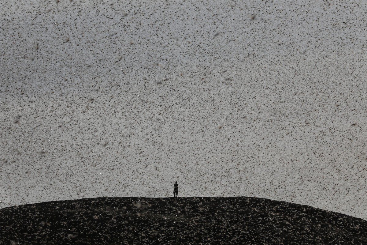 A child tries to chase away a swarm of desert locusts in Naiperere, near the town of Rumuruti, Kenya, January 30, 2021. REUTERS/Baz Ratner