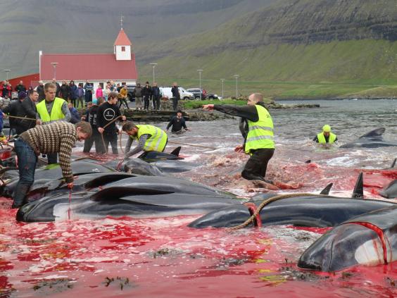 Grisly photos of the Faroe Islands traditional “grindadrap”, which sees migrating pilot whales and dolphins herded towards the shore and slaughtered, have been released by a campaign group.