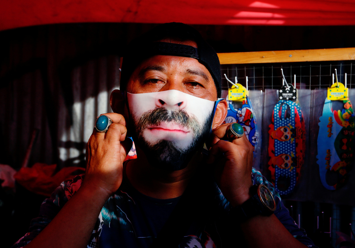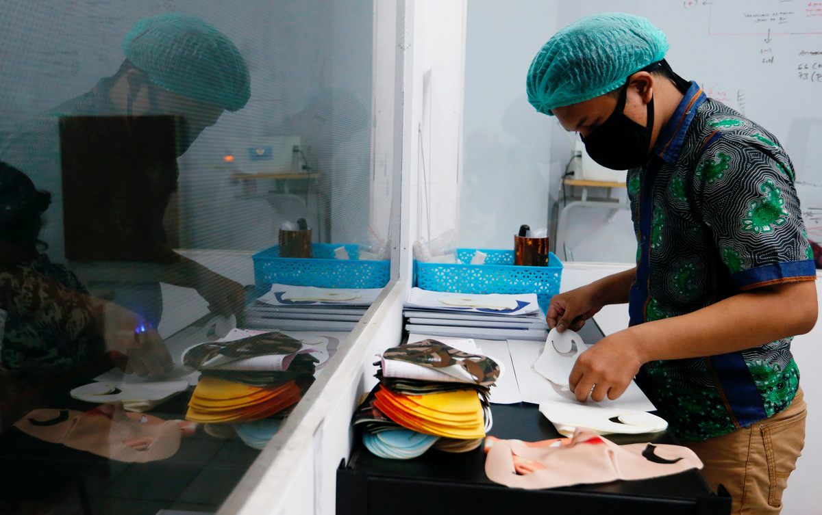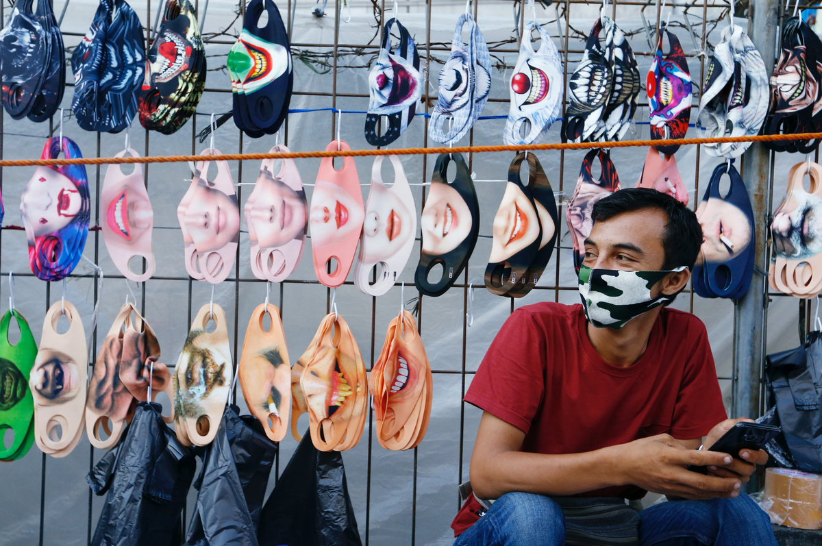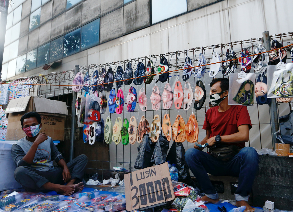FILE PHOTO: Vendors sit near a face design masks display at a traditional market, amid the coronavirus disease (COVID-19) outbreak in Jakarta, Indonesia June 23, 2020. REUTERS/Ajeng Dinar UlfianaFILE PHOTO: A printing shop employee editing customer's photo designs a face mask, amid the coronavirus disease (COVID-19) outbreak, in Jakarta, Indonesia June 23, 2020. REUTERS/Ajeng Dinar UlfianaFILE PHOTO: A man wears a face design mask at a traditional market to prevent the spread of the coronavirus disease (COVID-19) outbreak in Jakarta, Indonesia June 23, 2020. REUTERS/Ajeng Dinar UlfianaFILE PHOTO: A vendor sells face design masks at a traditional market to prevent the spread of the coronavirus disease (COVID-19) outbreak, in Jakarta, Indonesia June 23, 2020. REUTERS/Ajeng Dinar UlfianaFILE PHOTO: An employee wearing a protective mask and hair cap peels off a face design mask, amid the coronavirus disease (COVID-19) outbreak, in Jakarta, Indonesia June 23, 2020. REUTERS/Ajeng Dinar UlfianaFILE PHOTO: A worker wears a protective face design mask at a printing shop, amid the coronavirus disease (COVID-19) outbreak, in Jakarta, Indonesia June 23, 2020. REUTERS/Ajeng Dinar Ulfiana