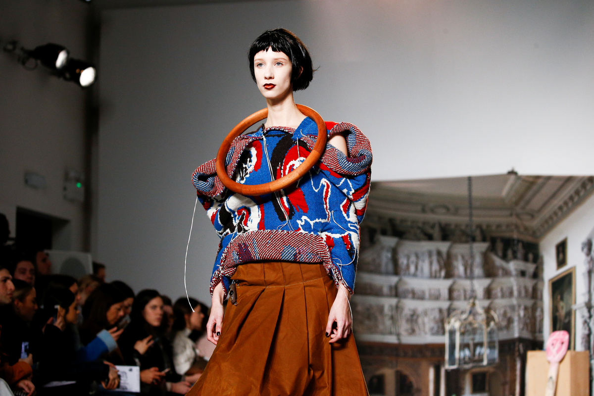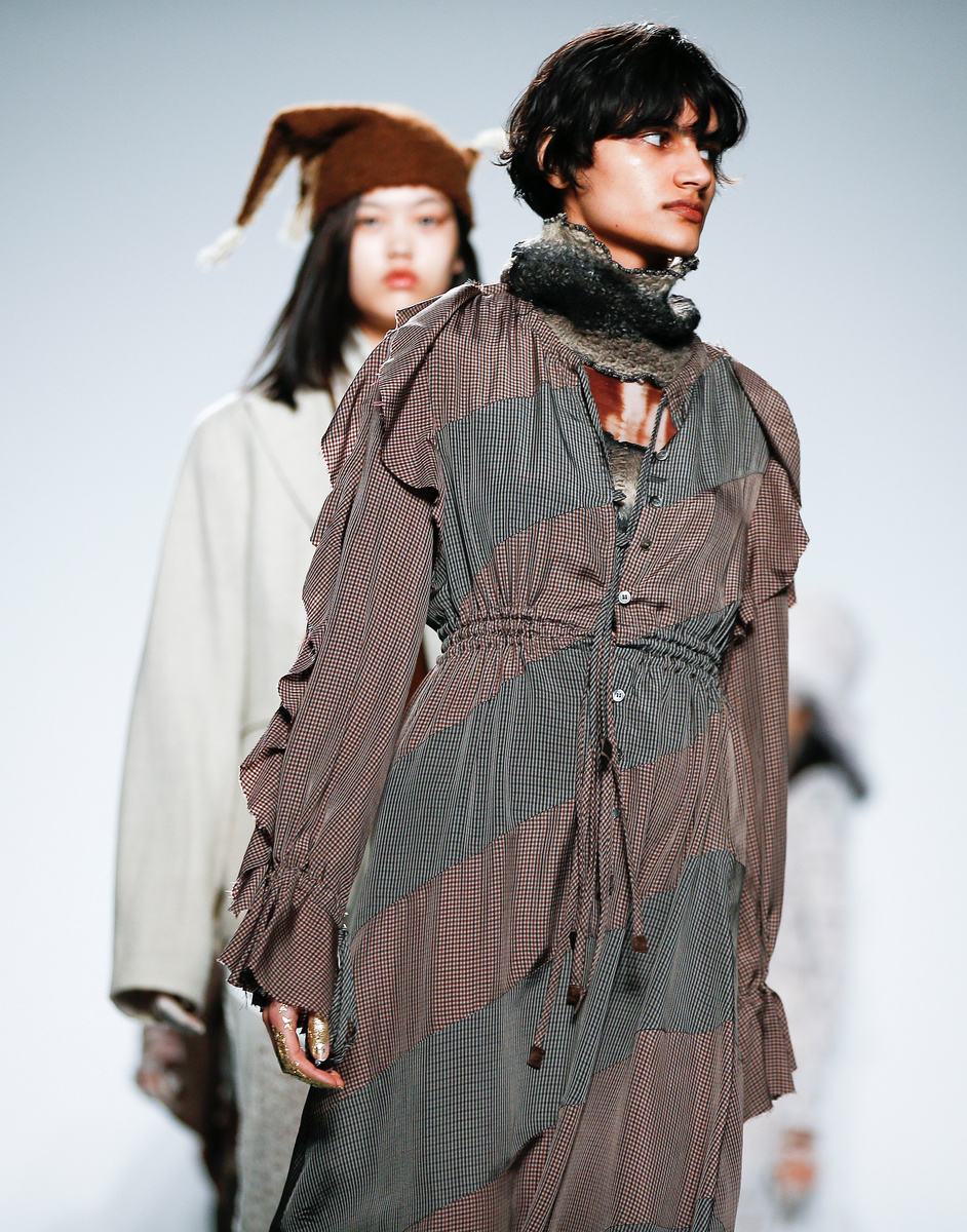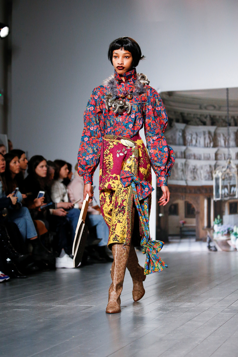 Models wore Liberty print blouses with Edwardian necklines and frilled shoulders, at times deconstructed and matched with other florals. Voluminous skirts were sequined or layered in clashing prints, knit crochet or a mix of fabrics. The looks were topped with eye-catching headgear and large keyrings.
