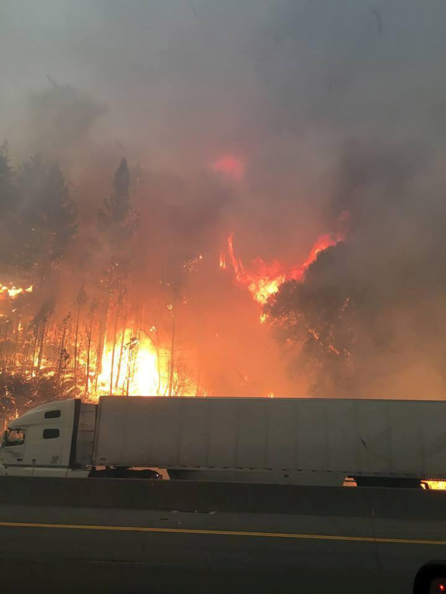 Photos posted online by the U.S. Forest Service showed bright orange flames in a forest just beyond a truck on a highway, and broad columns of white smoke rising above forests.