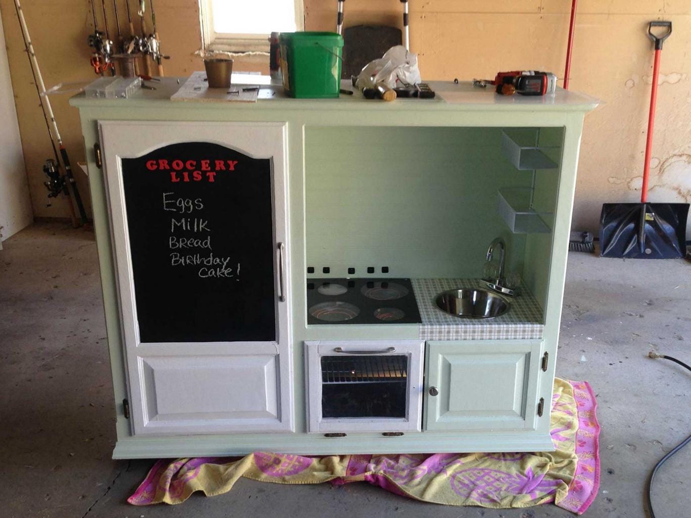 Reddit user SixStringHook and his wife made his two-year-old son an epic toy kitchen set – complete with a “working” stove and sink for his birthday – from an entertainment cupboard sourced from a charity shop.