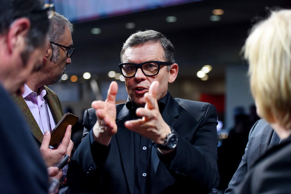 Even under such pressure, Schreyer maintained a friendly, relaxed demeanor at the New York auto show on Wednesday. He was dressed, as always, in a black suit with a black shirt, plus a black ascot with white polka dots. His glasses had black 3D-printed Mykita Mylon frames made in Germany.