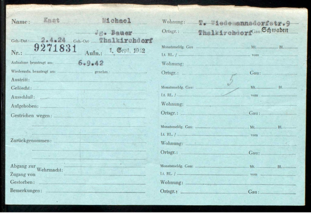 German officials confirmed this week that an ID card in the country's Federal Archive shows that an 18-year-old named Michael Kast joined the National Socialist German Workers’ Party, or NSDAP, on Sept. 1, 1942, at the height of Hitler's war on the Soviet Union.