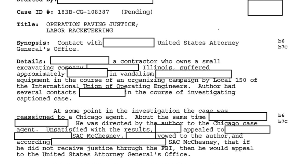 The same document says: “Throughout the course of other investigations into activity by Local 150, witnesses have changed their stories, suddenly refused to cooperate, and one key witness in a bombing investigation allegedly committed suicide shortly before the trial. One man who testified against members of Local 150 in a civil matter awoke one morning to find [blacked out].”