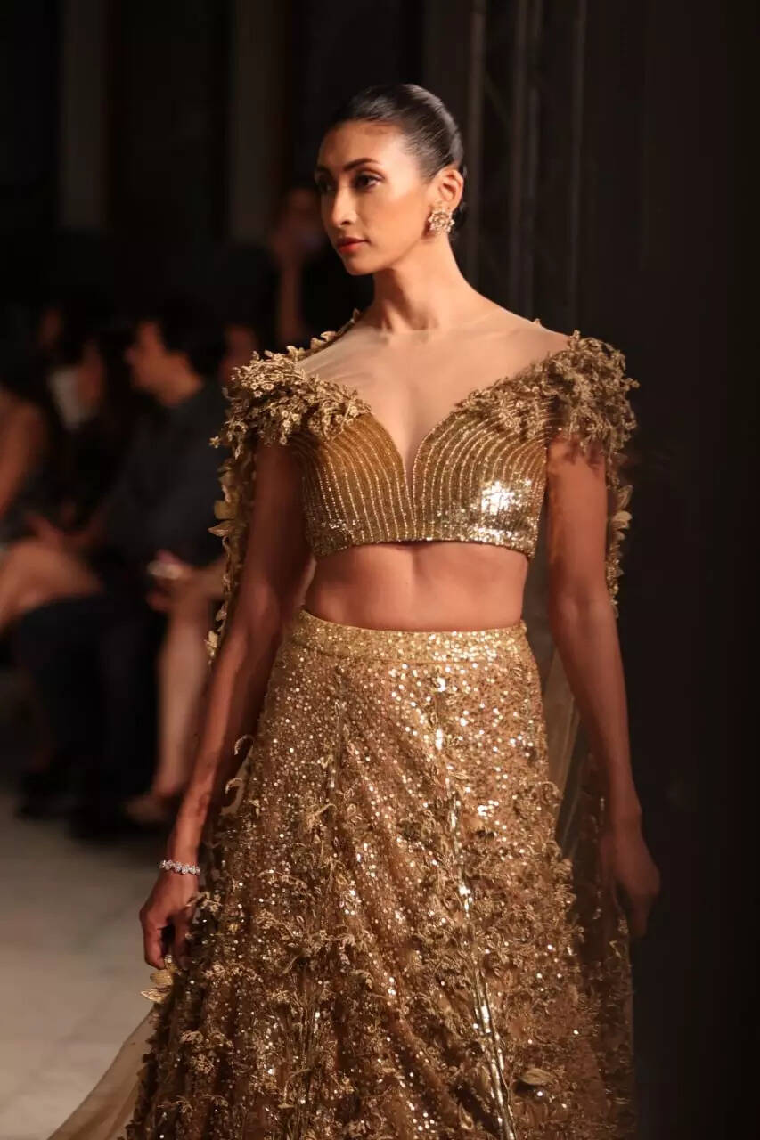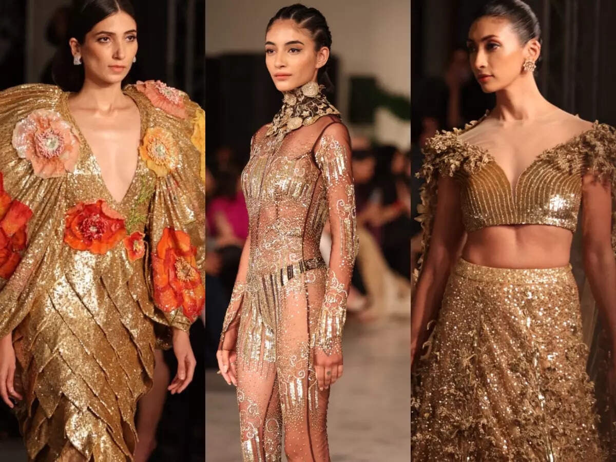 The designer injected a lot of gold and sequins into his collection. His menswear was equal parts opulent and of the moment. There were embroidered jackets and pants teamed with sheer vest, sequined kurta-pajama set with a floral bundi and golden embroidered bandhagalas for men.