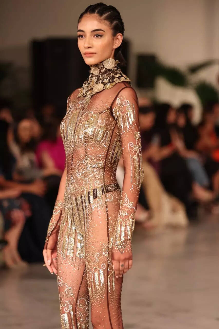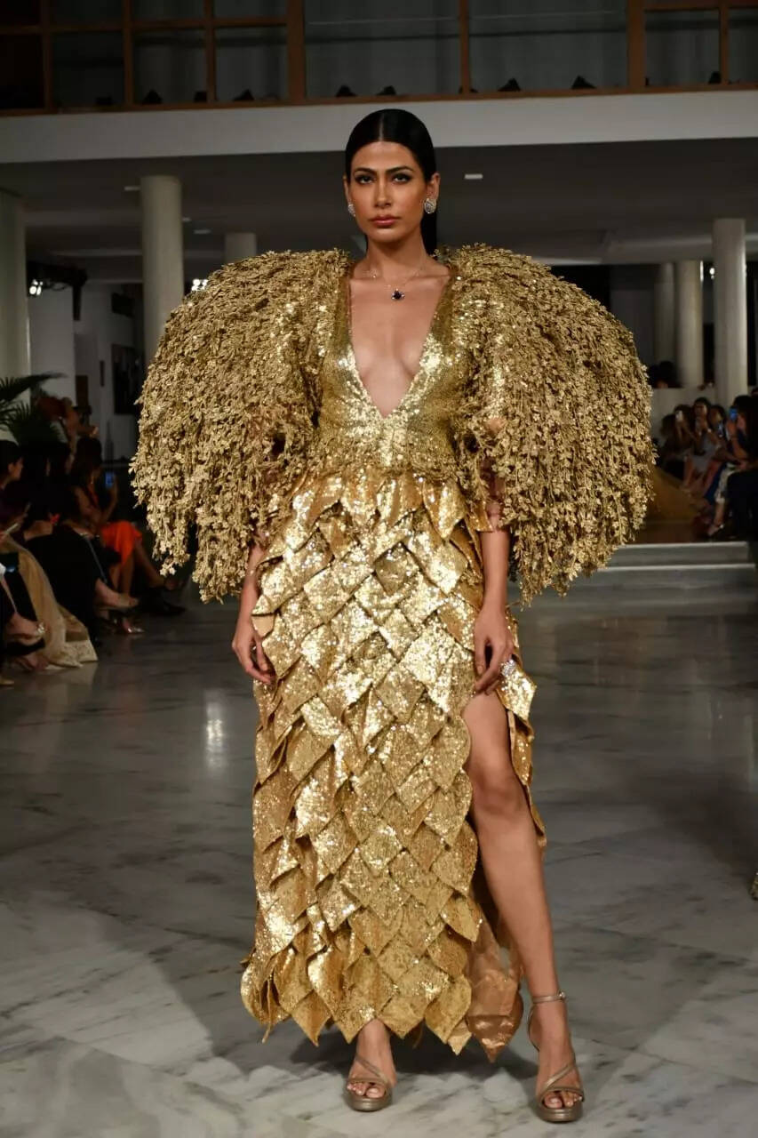 The garments which stood out in his collection were the sheer catsuits with gold embroidery and 3D embroidered leaf dress with exaggerated shoulders.