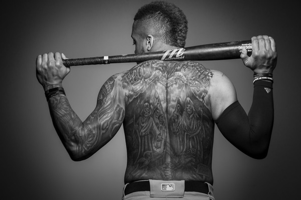 Between the two mountain peaks, there was an empty spot. DeShields asked Vega to incorporate his uniform number, 3. DeShields said he wears three in honor of the Holy Trinity. Vega added it with angel wings.