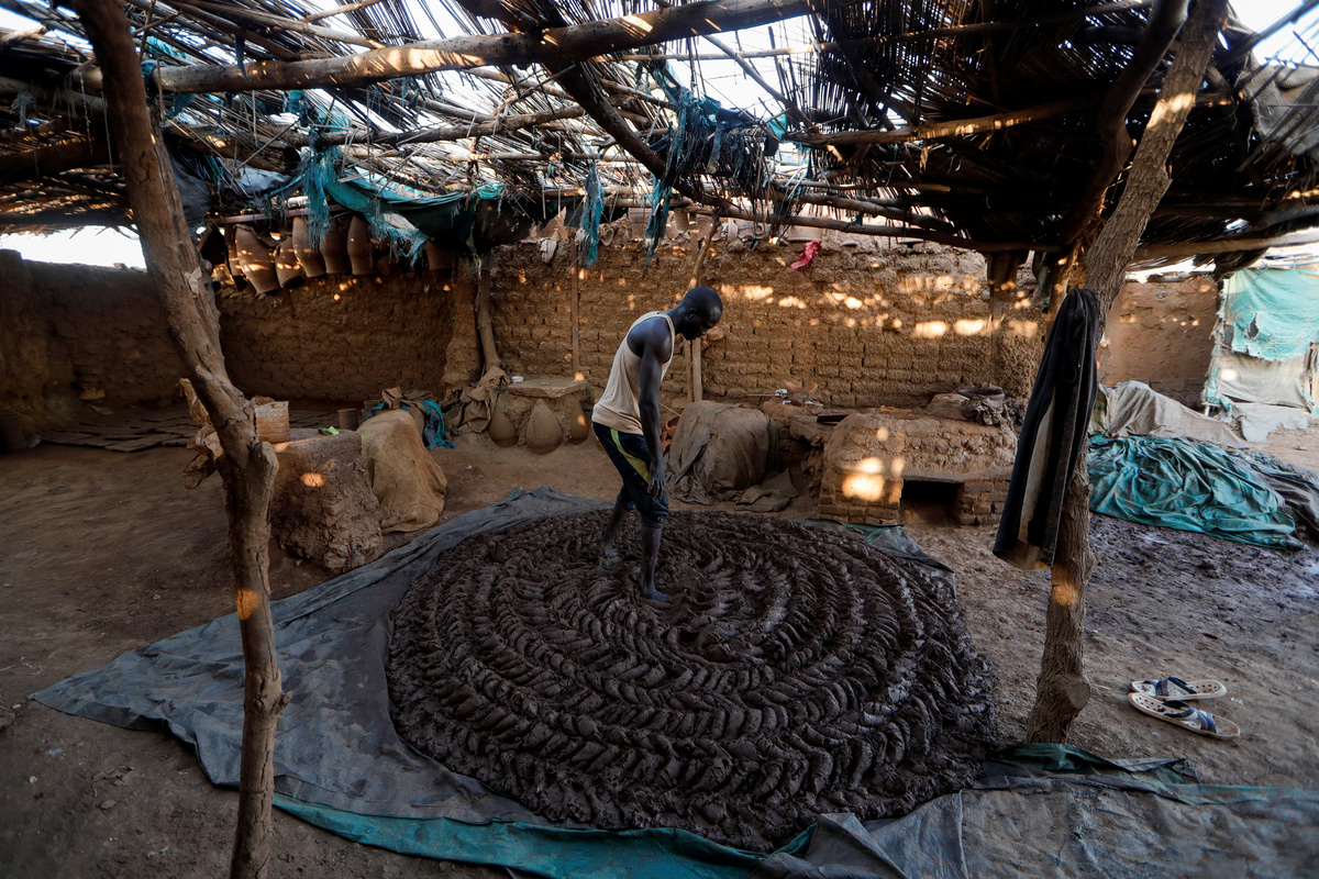 David Plantino, 35, a pottery maker from South Sudan, kneads mud with his feet, that will be used to make pottery at a workshop in an area known as the 'Potters Village' in Alqamayir, Omdurman, Sudan February 16, 2020. "I have been a pottery maker for 7 years, I relied on the Nile river like most people around me here for water and the mud", Plantino said. "Both are the foundation for people who rely on pottery to make a living." REUTERS/Zohra Bensemra