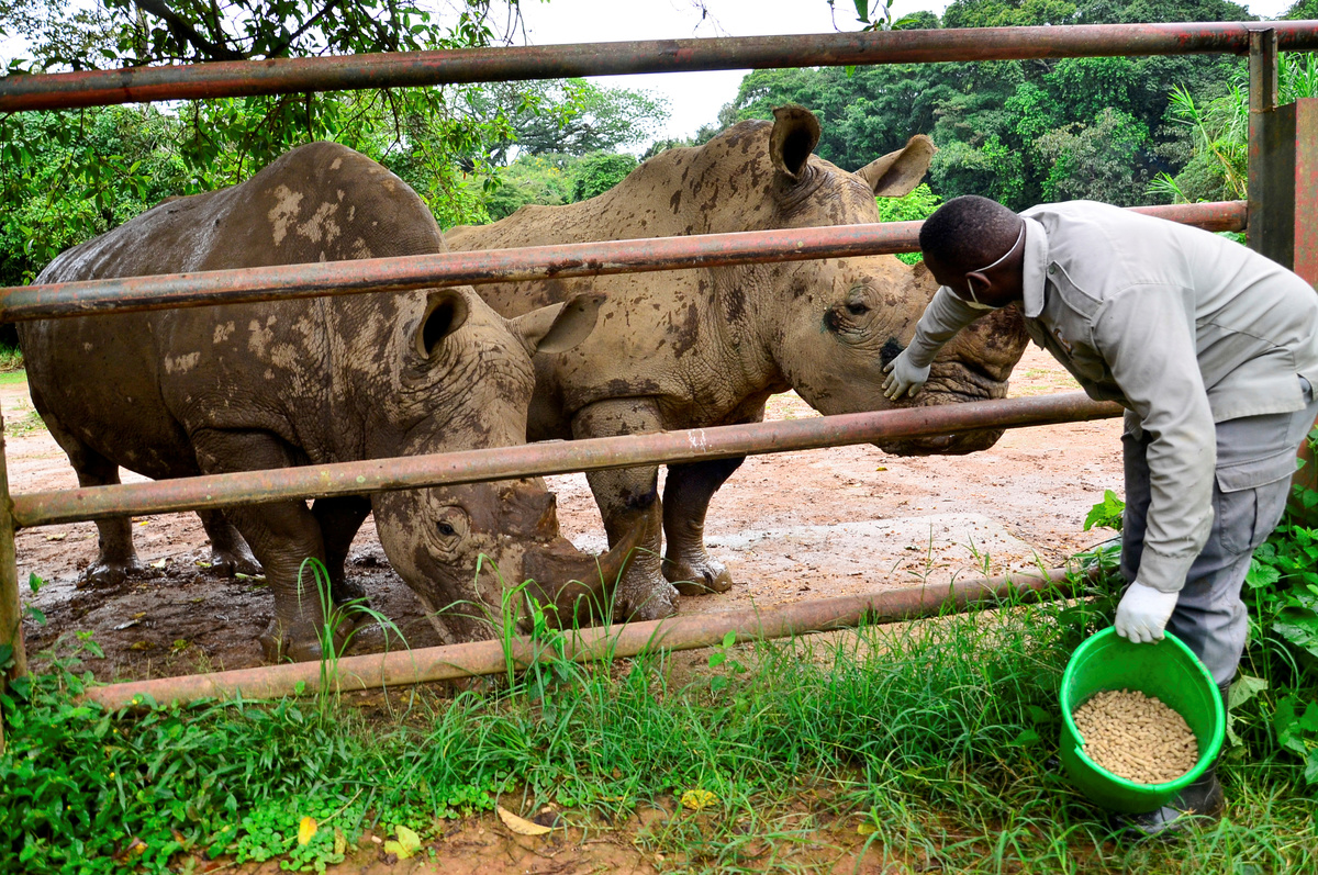 Steven Busulwa, an animal keeper, feeds rhinos at the Uganda Wildlife Conservation Education Center (UWEC) amid the lockdown as part of the measures taken to prevent the spread of the coronavirus disease (COVID-19), within Wakiso district, in Entebbe, Uganda April 20, 2020. REUTERS/Abubaker Lubowa