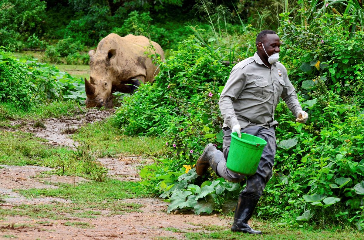Steven Busulwa, an animal keeper, runs away from a charging rhino at the Uganda Wildlife Conservation Education Center (UWEC) amid the lockdown as part of the measures taken to prevent the spread of the coronavirus disease (COVID-19), within Wakiso district, in Entebbe, Uganda April 20, 2020. REUTERS/Abubaker Lubowa Steven Busulwa, an animal keeper, runs away from a charging rhino at the Uganda Wildlife Conservation Education Center (UWEC) amid the lockdown as part of the measures taken to prevent the spread of the coronavirus disease (COVID-19), within Wakiso district, in Entebbe, Uganda April 20, 2020. REUTERS/Abubaker Lubowa A rhino is seen at the Uganda Wildlife Conservation Education Center (UWEC), amid the lockdown as part of the measures taken to prevent the spread of the coronavirus disease (COVID-19), within Wakiso district, in Entebbe, Uganda April 20, 2020. REUTERS/Abubaker Lubowa A lioness is seen at the Uganda Wildlife Conservation Education Center (UWEC) amid the lockdown as part of the measures taken to prevent the spread of the coronavirus disease (COVID-19), within Wakiso district, in Entebbe, Uganda April 20, 2020. REUTERS/Abubaker Lubowa Steven Busulwa, an animal keeper, speaks during a Reuters interview at the Uganda Wildlife Conservation Education Center (UWEC), amid the lockdown as part of the measures taken to prevent the spread of the coronavirus disease (COVID-19), within Wakiso district, in Entebbe, Uganda April 20, 2020. REUTERS/Abubaker Lubowa