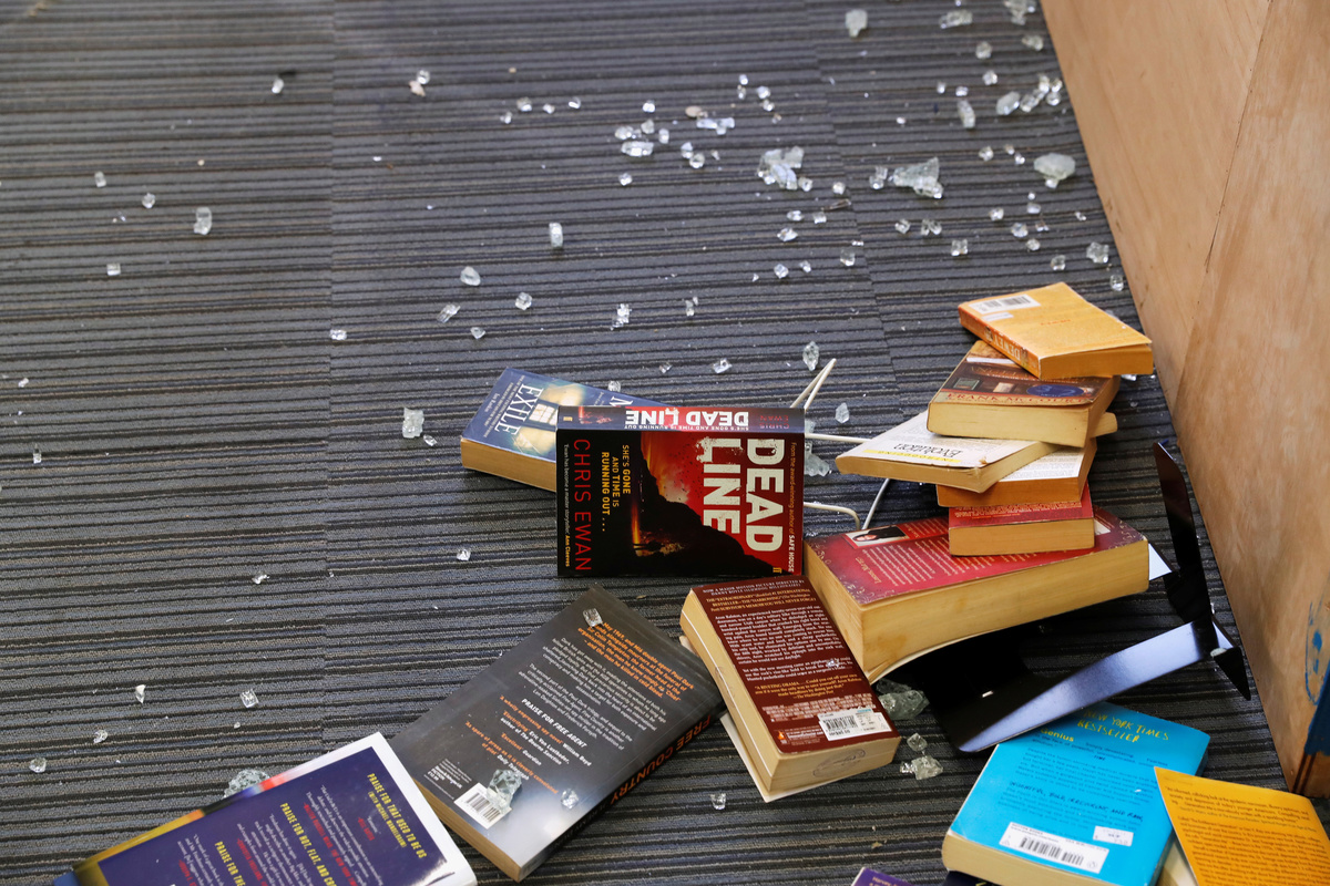 Much of the campus is damaged, with rooms vandalised and windows shattered, though electricity and water are still functioning. In a library, most books were untouched but makeshift petrol bombs were left on desks.