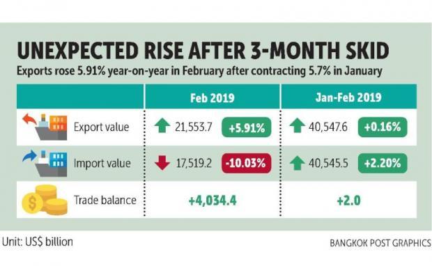 Exports in baht terms rose by 5.5% in February from the same month last year to 678.50 billion baht.