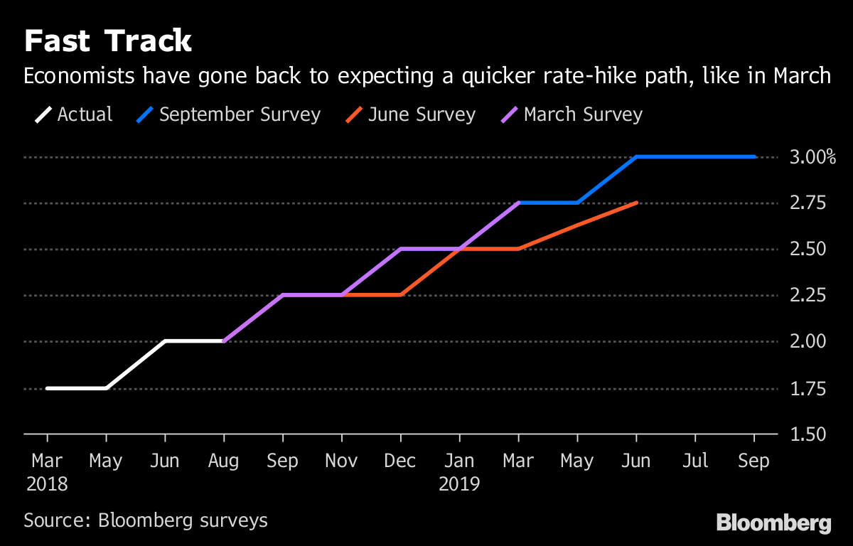 In a poll conducted Sept. 18-20, economists expected the upper boundary of the Fed’s target range for the federal funds rate to hit 3 percent in June 2019 and stay there until the fourth quarter, when they saw a third hike for the year. That’s a slight step up in pace from the previous survey three months ago when the median estimate was for 2.75 percent in June. The target range for the policy rate currently is 1.75 percent to 2 percent.