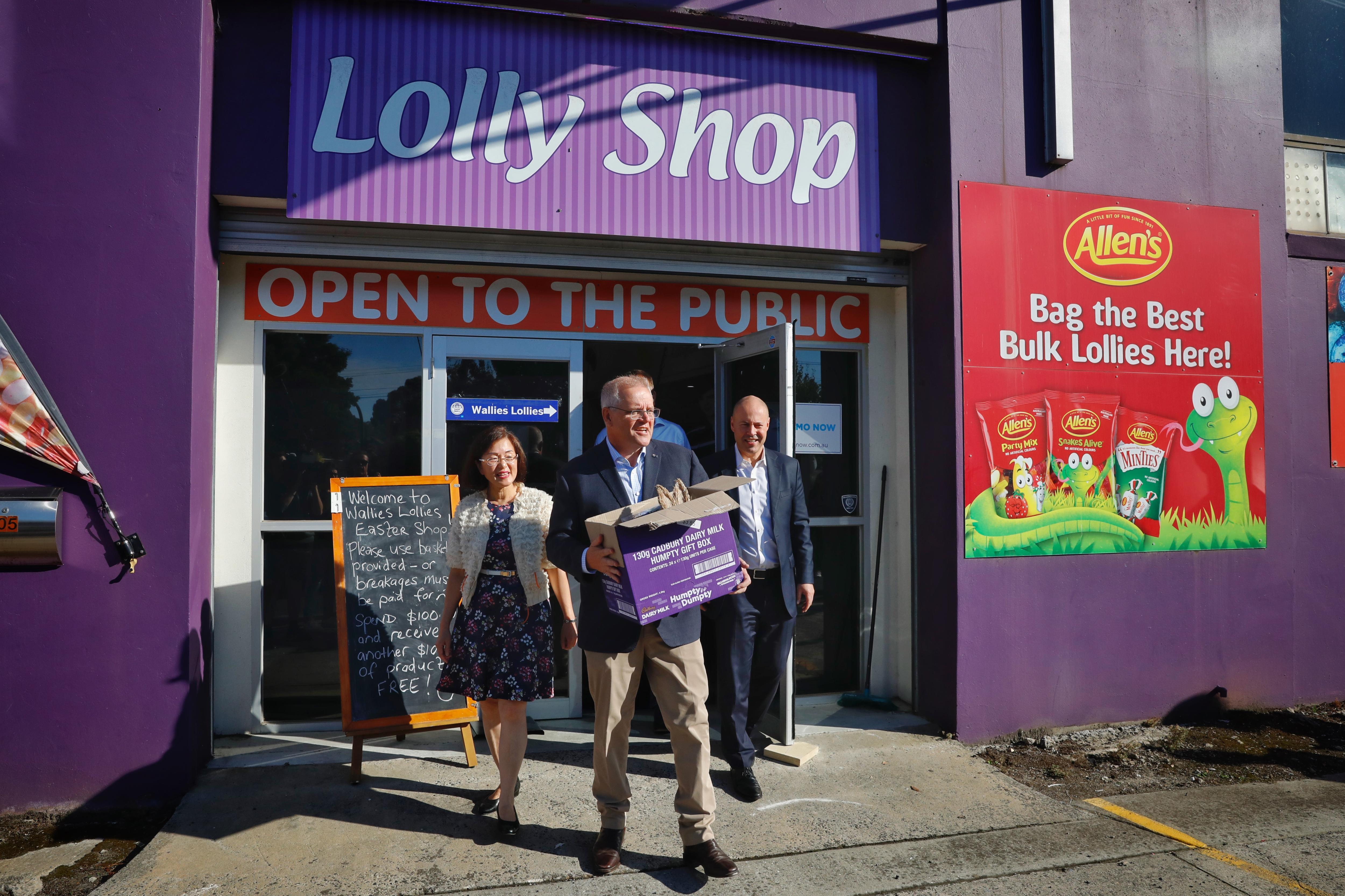 Mr Morrison appears to have snagged a box of goodies at a campaign stop with Treasurer Josh Frydenberg and MP Gladys Liu. (ABC News: Luke Stephenson)