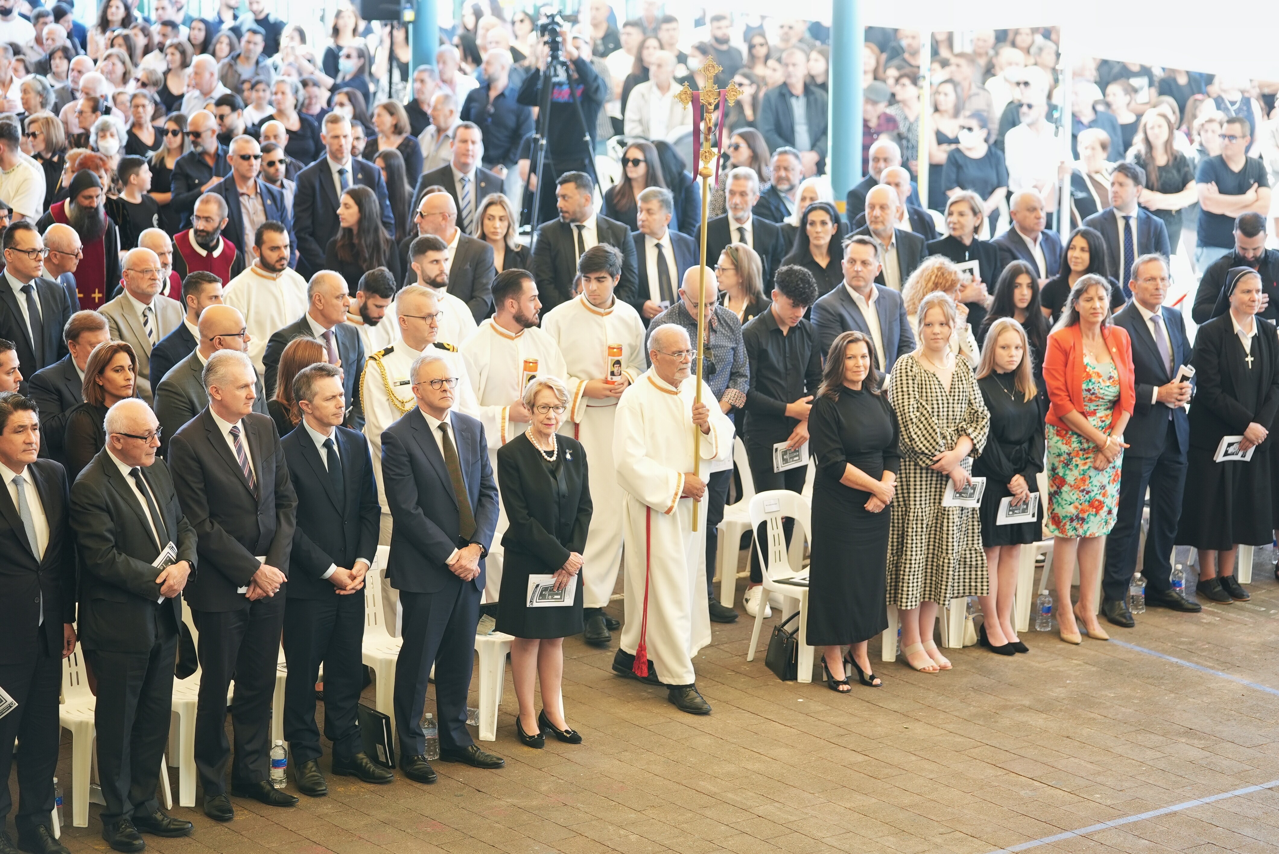 Anthony Albanese attends a Good Friday service. Mr Morrison's wife, Jenny, and two children, Lily and Abbey, are also in attendance, along with former prime minister Tony Abbott. (ABC News: Matt Roberts) (ABC News: Matt Roberts)