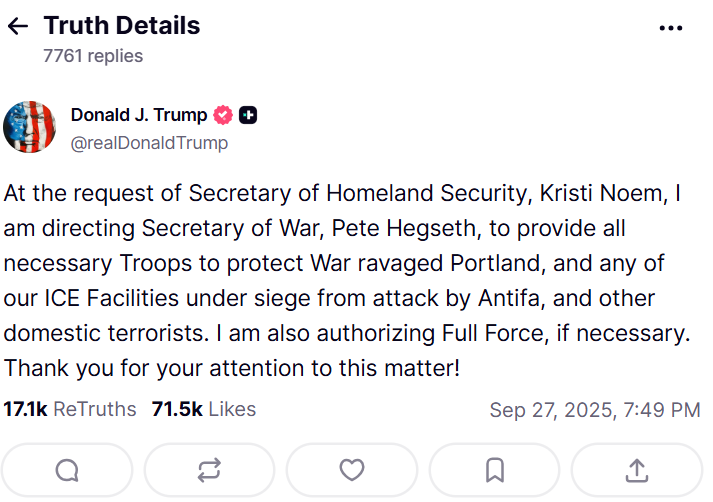 Oregon's Democratic Attorney General Dan Rayfield filed the lawsuit on September 28, a day after President Trump announced his plan to deploy troops to Portland to guard federal immigration facilities, which he described as being threatened by "domestic terrorists," according to a Reuters report.