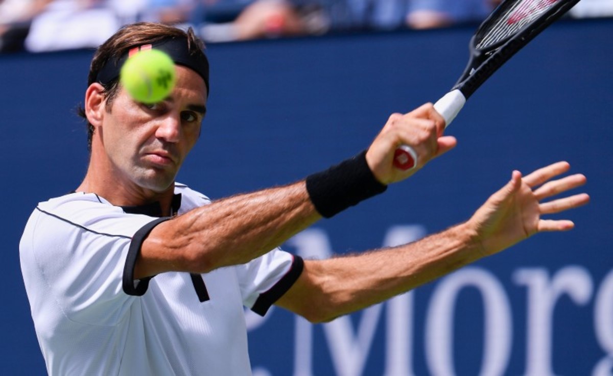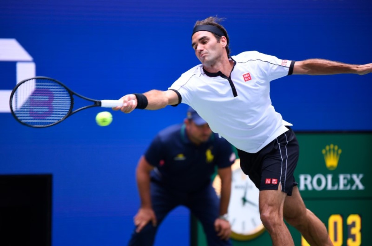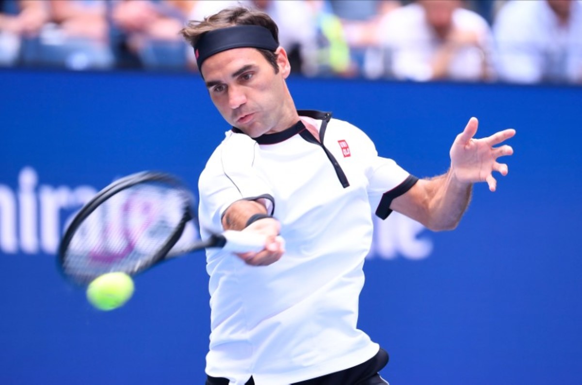 Roger Federer of Switzerland hits to David Goffin of Belgium in the fourth round on day seven of the 2019 U.S. Open tennis tournament at USTA Billie Jean King National Tennis Center. Mandatory Credit: Robert Deutsch-USA TODAY Sports