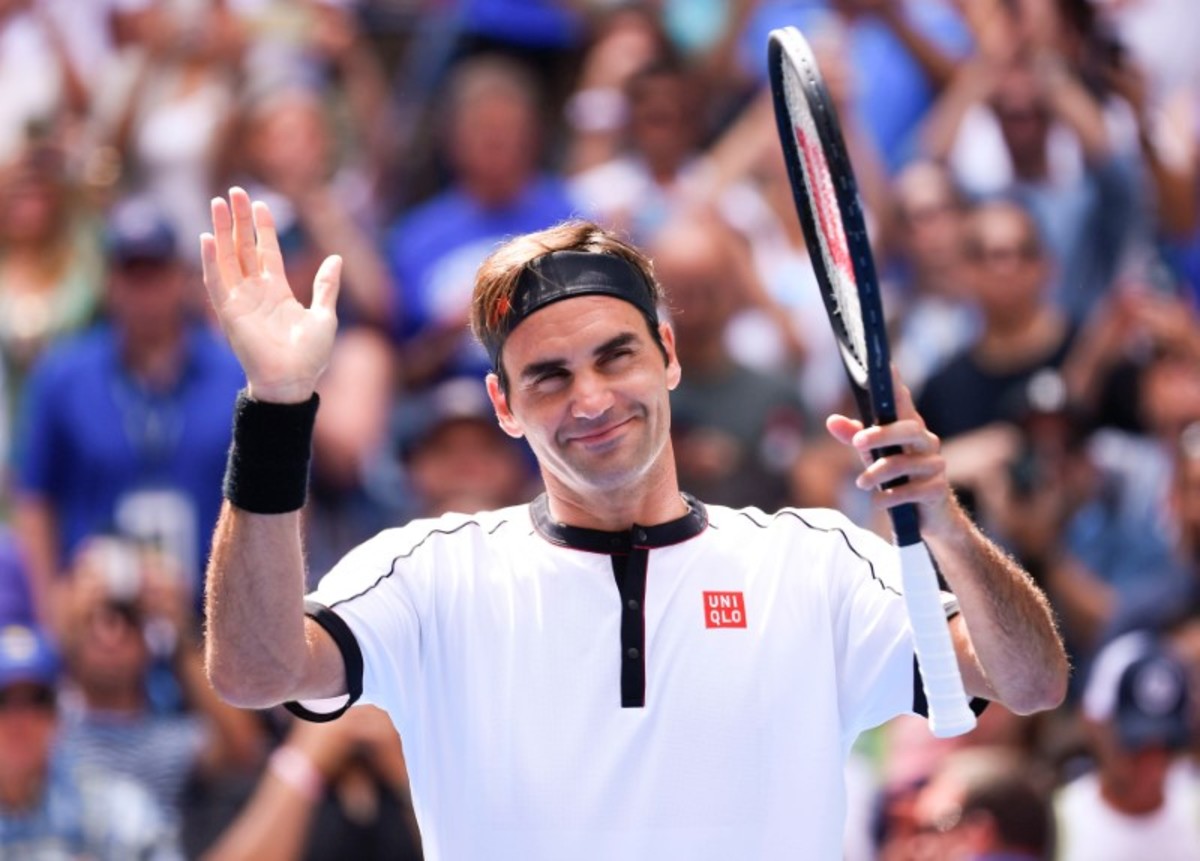 Roger Federer of Switzerland reacts after beating David Goffin of Belgium in the fourth round on day seven of the 2019 U.S. Open tennis tournament at USTA Billie Jean King National Tennis Center. Mandatory Credit: Robert Deutsch-USA TODAY Sports
