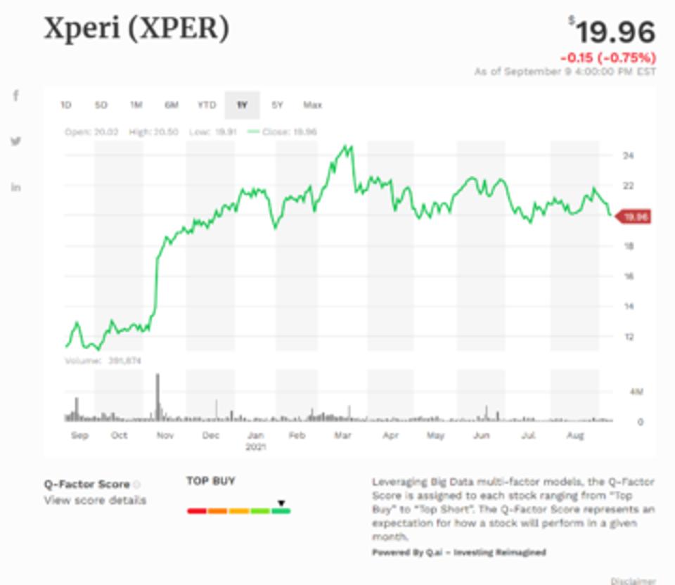 Xperi Holding Corp is our final Top Buy of the day. Xperi Holding Corp is a licenser of technology and intellectual property in sectors such as mobile computing, communications, memory and data storage, three-dimensional integrated circuit technologies, and more. Our AI systems rated the company A in Technicals, B in Growth, B in Low Volatility Momentum, and B in Quality Value. The stock closed down 0.75% to $19.96 on volume of 391,987 vs its 10-day price average of $20.93 and its 22-day price average of $20.75, and is down 1.82% for the year. Revenue grew by 21.14% in the last fiscal year and grew by 166.07% over the last three fiscal years, Operating Income grew by 6.34% in the last fiscal year and grew by 426.24% over the last three fiscal years, and EPS grew by -14422.39% over the last three fiscal years. Revenue was $892.02M in the last fiscal year compared to $406.13M three years ago, Operating Income was $247.83M in the last fiscal year compared to $50.08M three years ago, EPS was $1.75 in the last fiscal year compared to $(0.01) three years ago, and ROE was 14.41% in the last year compared to (0.33%) three years ago. The stock is also trading with a Forward 12M P/E of 13.8.