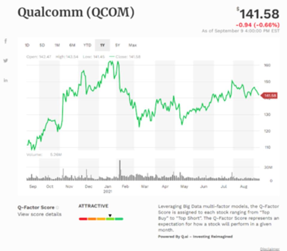 Semiconductor giant Qualcomm is our third Top Buy today. Outside of producing semiconductors, the San Diego-based Qualcomm creates intellectual property, software, and services related to wireless technology. Our AI systems rated Qualcomm C in Technicals, B in Growth, B in Low Volatility Momentum, and A in Quality Value. The stock closed down 0.66% to $141.58 on volume of 6,190,783 vs its 10-day price average of $144.39 and its 22-day price average of $144.6, and is down 4.66% for the year. Revenue grew by 38.44% in the last fiscal year and grew by 44.07% over the last three fiscal years, Operating Income grew by 65.95% in the last fiscal year and grew by 173.82% over the last three fiscal years, and EPS grew by 77.05% in the last fiscal year and grew by -335.85% over the last three fiscal years. Revenue was $23531.0M in the last fiscal year compared to $22611.0M three years ago, Operating Income was $6227.0M in the last fiscal year compared to $3774.0M three years ago, EPS was $4.52 in the last fiscal year compared to $(3.39) three years ago, and ROE was 94.63% in the last year compared to (31.46%) three years ago. Forward 12M Revenue is expected to grow by 8.8% over the next 12 months, and the stock is trading with a Forward 12M P/E of 15.74.