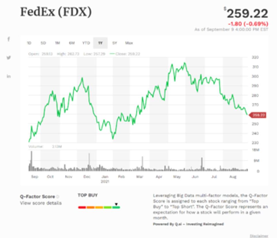 Fedex Corp is our second Top Buy today. FedEx is a delivery and logistics giant whose importance cannot be overstated due to surging growth and increased demand for e-commerce. Our AI systems rated Fedex B in Technicals, B in Growth, B in Low Volatility Momentum, and B in Quality Value. The stock closed down 0.69% to $259.22 on volume of 2,132,772 vs its 10-day price average of $264.95 and its 22-day price average of $269.17, and is up 2.38% for the year. Revenue was $83959.0M in the last fiscal year compared to $69693.0M three years ago, Operating Income was $7956.0M in the last fiscal year compared to $1581.0M three years ago, EPS was $19.48 in the last fiscal year compared to $2.03 three years ago, and ROE was 24.64% in the last year compared to 2.91% three years ago. The stock is also trading with a Forward 12M P/E of 12.18.